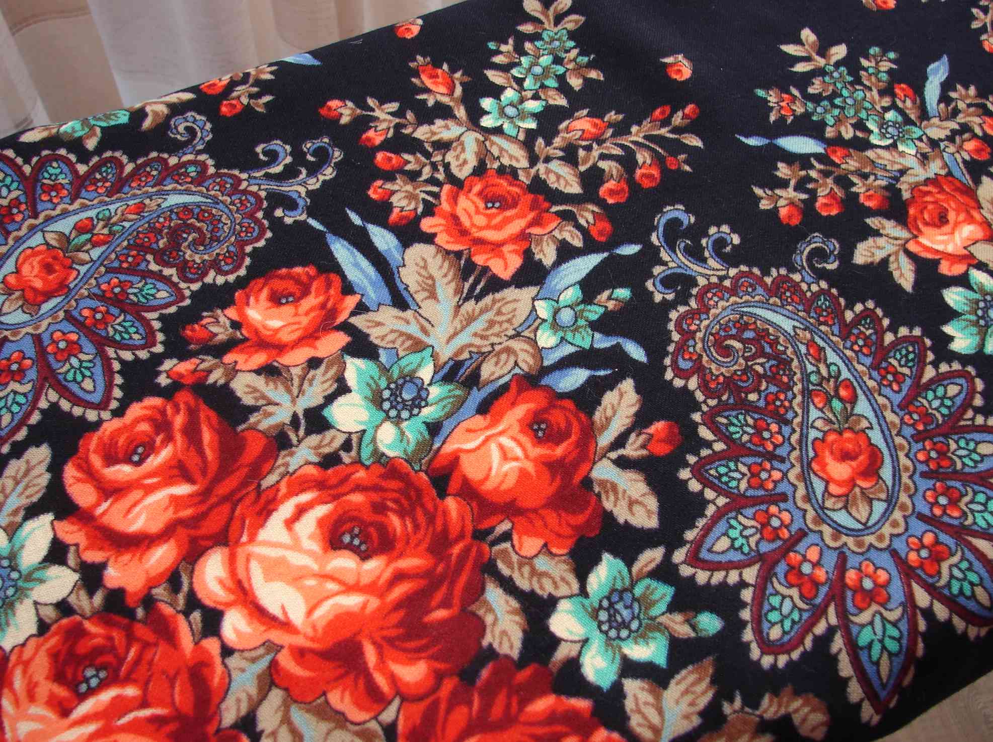Общий план: Фрагмент: И фото изнанки, для подтверждения синего, так-то выглядит почти как черный даже в жизни, а не только на на фото. Все фотографии без вспышки, которая может и выявила бы синюю основу, на прямом солнце сомнений в этом нет. Платок на удивление целый, если и стиран, то нерадикальными средствами, хотя бахрома была в ужасном состоянии. Я её сразу срезала. Может и не буду новую делать, на малышах она часто мне мешает.