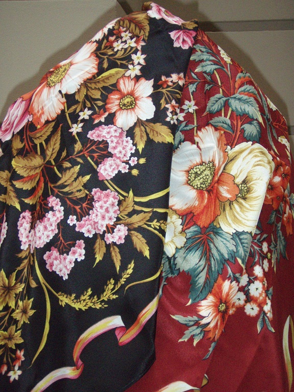 В продаже появились два очередные колорита платочка "Пёстрая лента" : красно-коричневый (-5) и чёрный (-18). Каждый по-своему красив. Отличие от предыдущих - принципиальное - здесь ленточка на однотонном поле (т.е. не служит "разделительной линией" между каймой и основным полем платка).