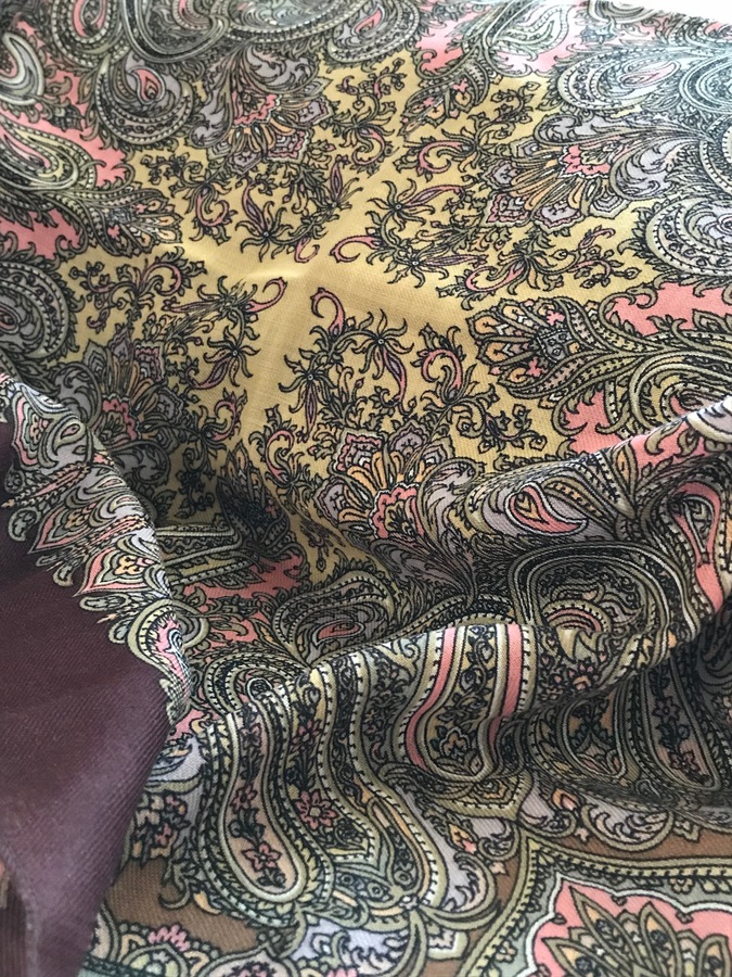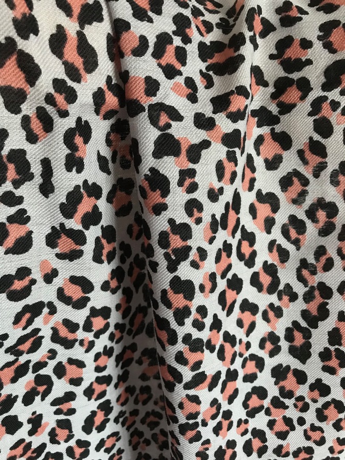 Оттенок пятнышек темно-лососевый и очень темно-коричневый, почти черный. Фон не серый, а бледно--лиловый --камера не передает( красиво сочетается с розовым и коричневым) . Бахрому сняла, так как буду утеплять ( вязать) изнанку тонкой шерстью или мохером ( лицевой гладью, по примеру шелковых палантинов на мохере) для зимы--к шубе (подошел идеально).