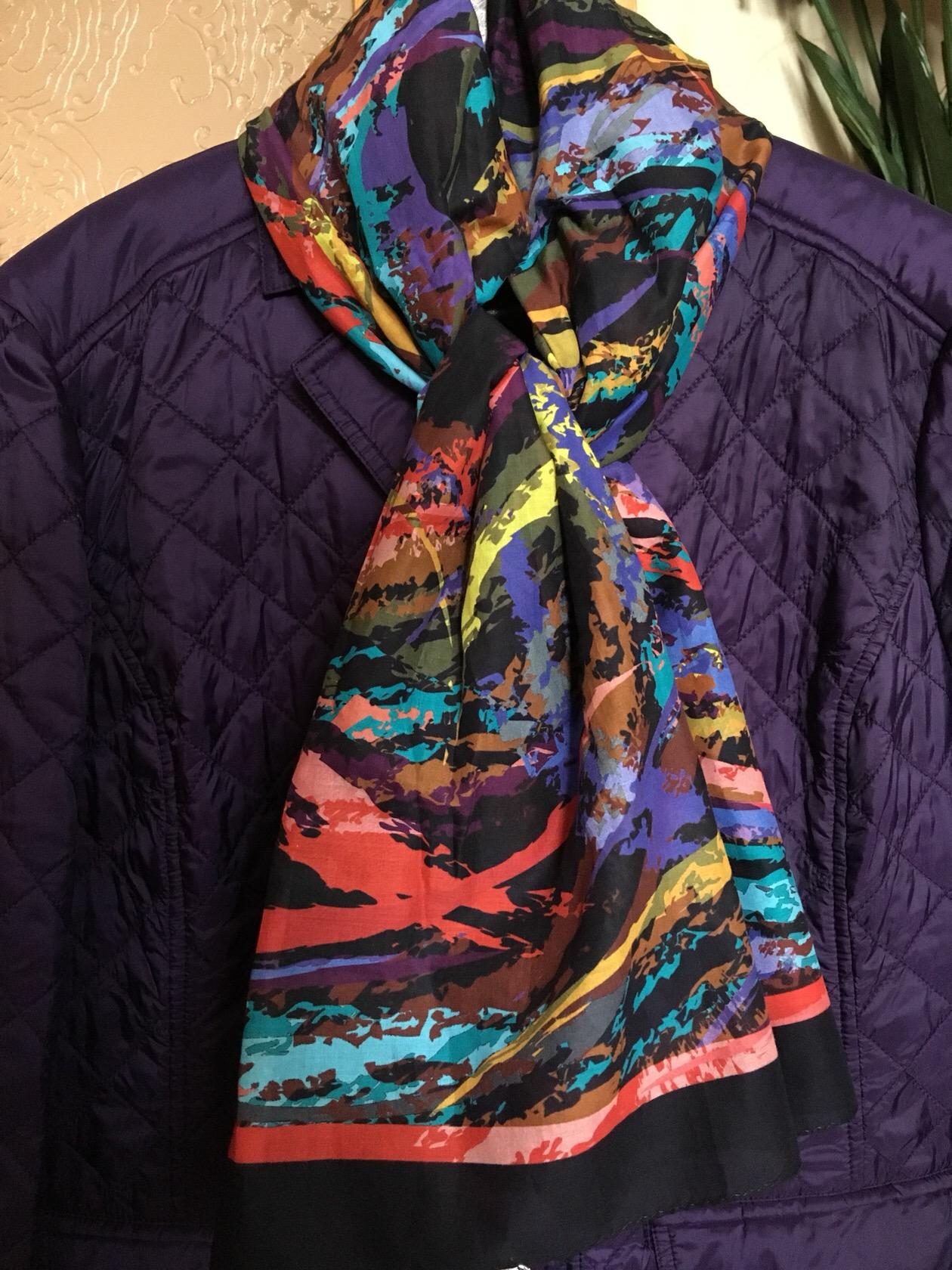 Я для теплых дней купила один, а на более прохладную погоду - сшила шарф-палантин из двух. Подходит под любую однотонную одежду очень хорошо. Редкий случай, когда черная рамка очень идет платку "малого размера".