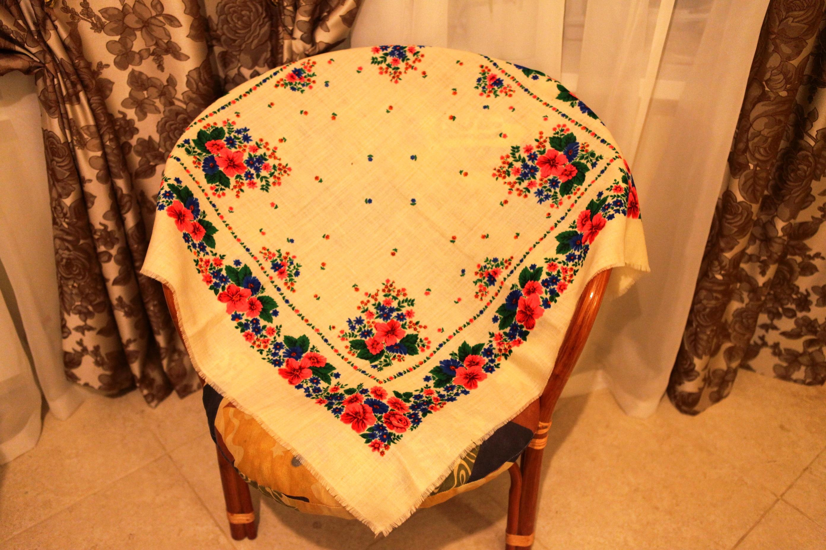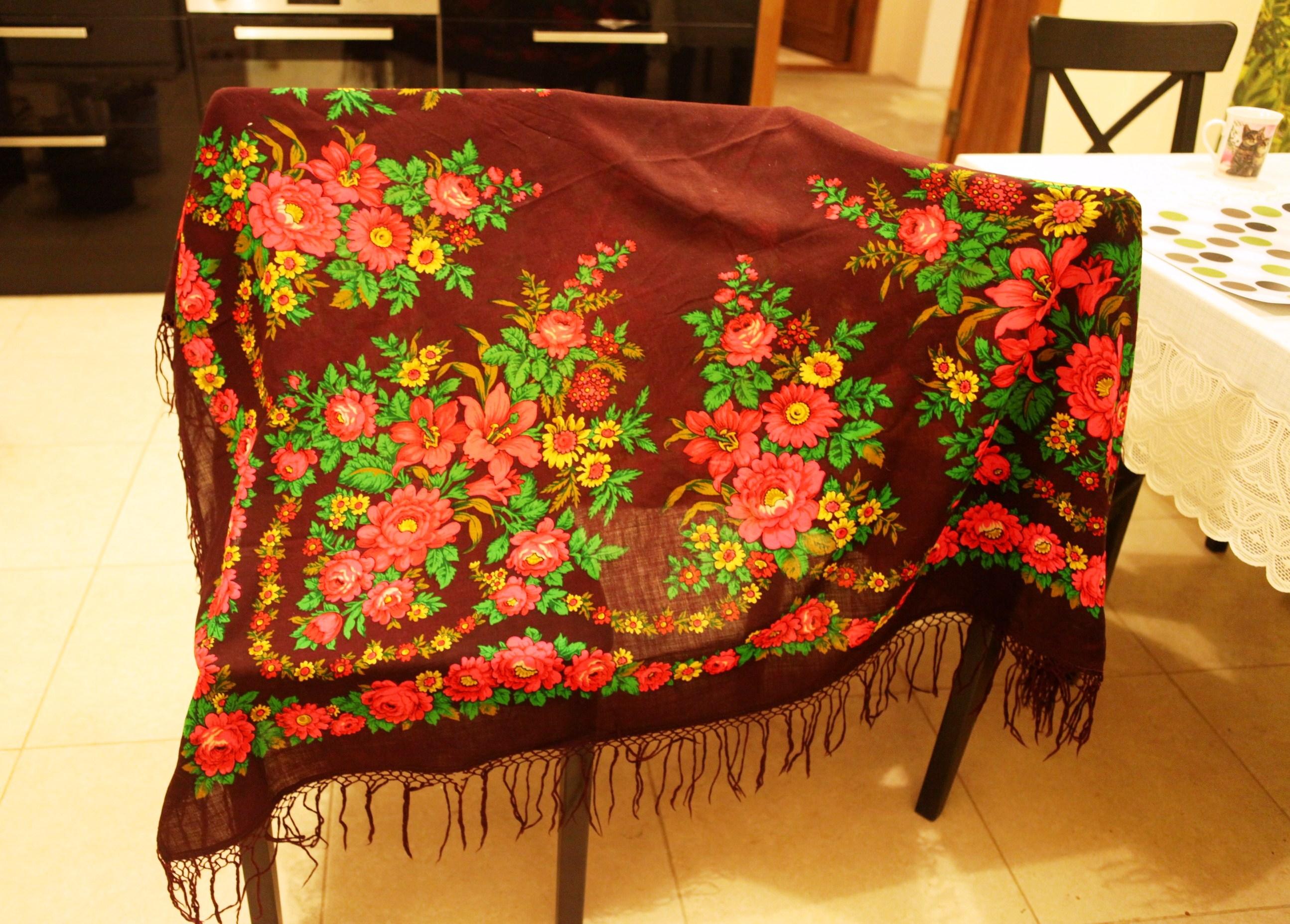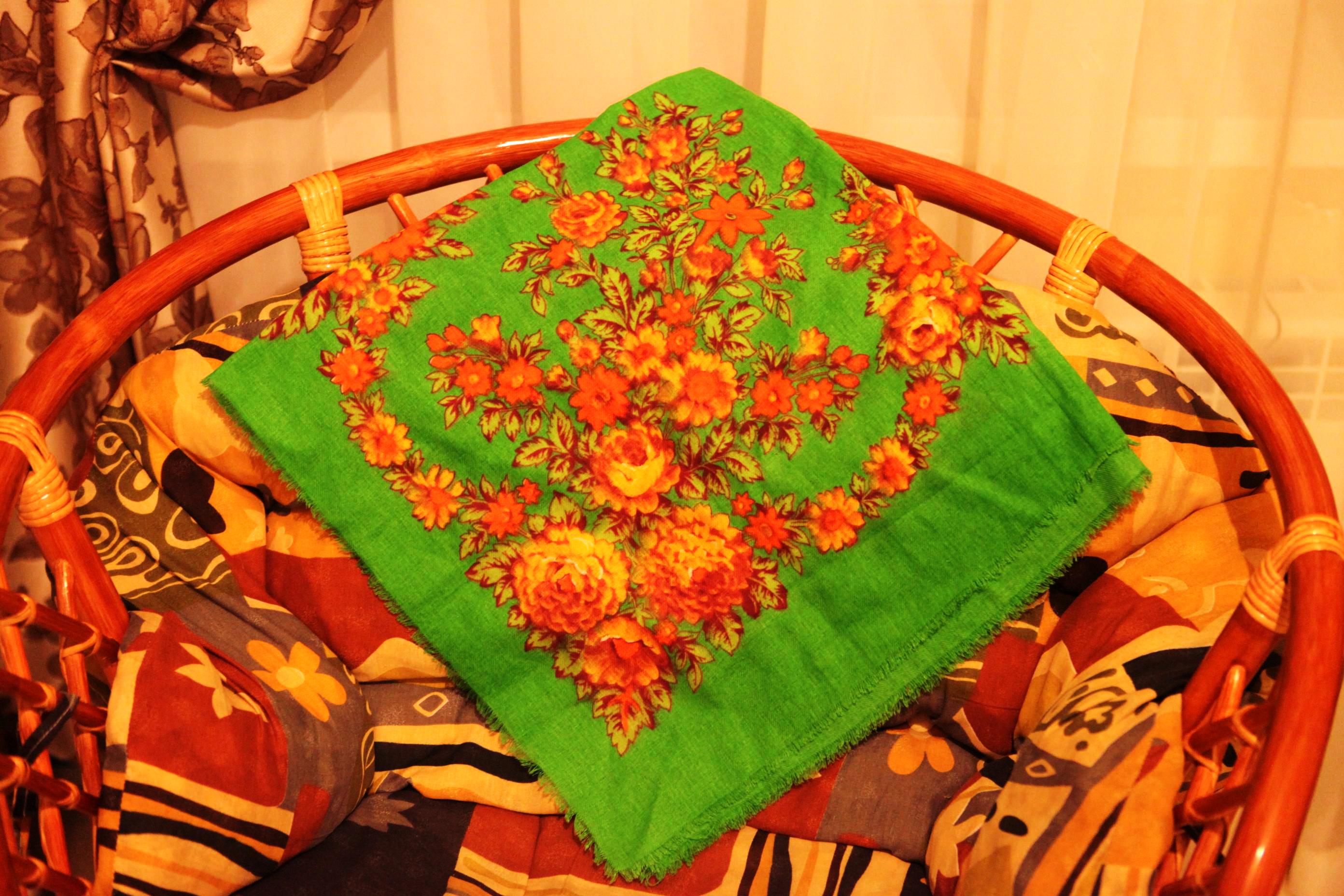 1. Неизвестная шаль размером не меньше 146х146. Со слов прежней владелицы, ей лет 15. Была уже на форуме в разных расцветках, у меня - ярко-изумрудная (на фото оттенок более блеклый):