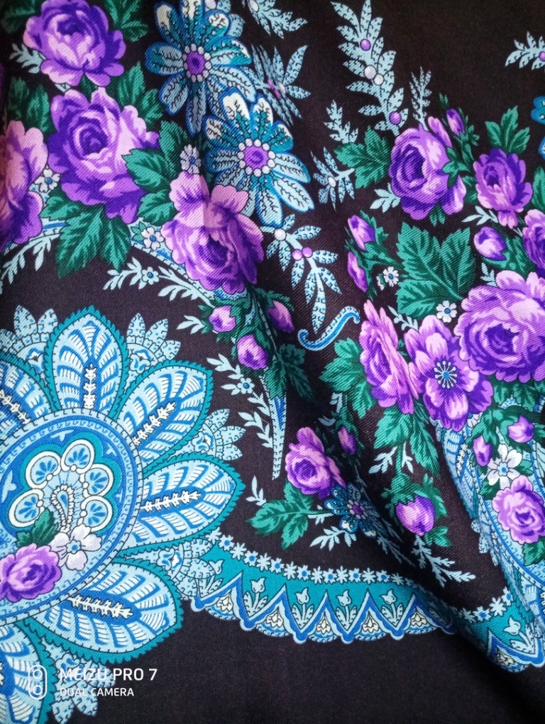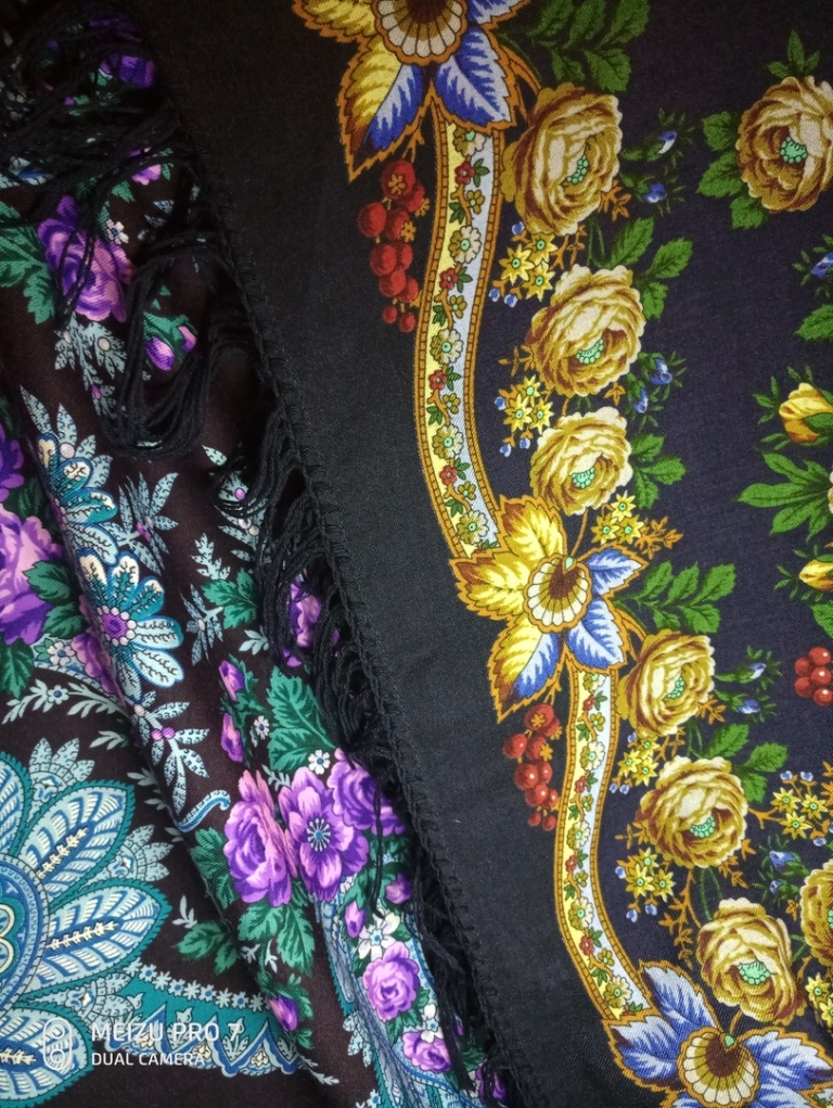 Продолжу, давно мечтала и наконец купила платок Черные глаза - 14. Красив по своему, самое большое на меня впечатление производят гирлянды из затемненных роз, будто бы из-под воды, по краю платка, ну и само собой красная смородина веточками. Но это для любования. На мне, и в гардеробе Черные глаза сильно проигрывает Цветочному вееру, как-то похож на "бабушкин" из сундука. Решила для себя - буду покупать современное, и осеклась - ведь ЦВ восстановленный рисунок. Но может быть дело в колористическом решении, качестве ткани? Магия. Для сравнения делала фото, но ЧГ вообще не дается на мой телефон, желтит, теряет красоту.