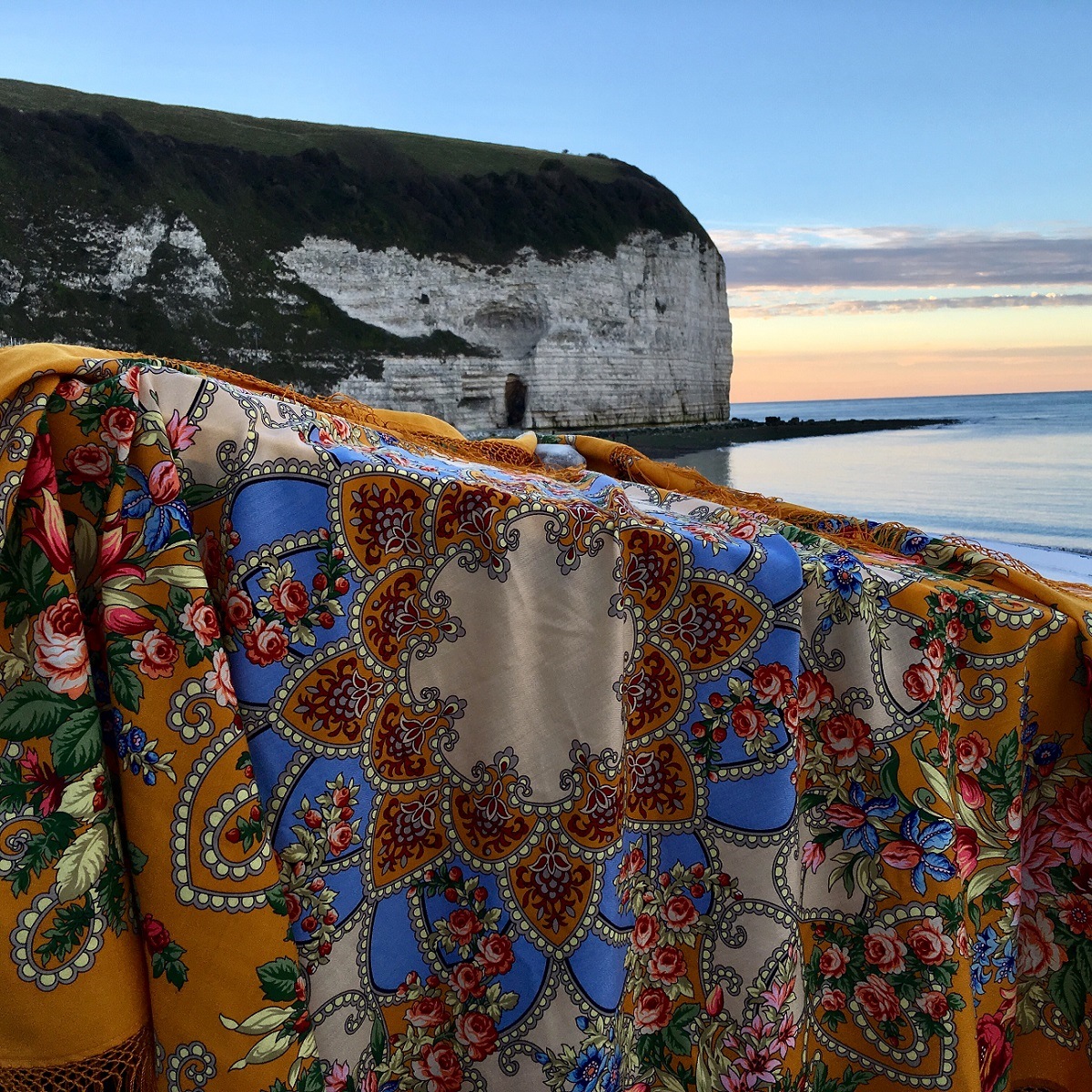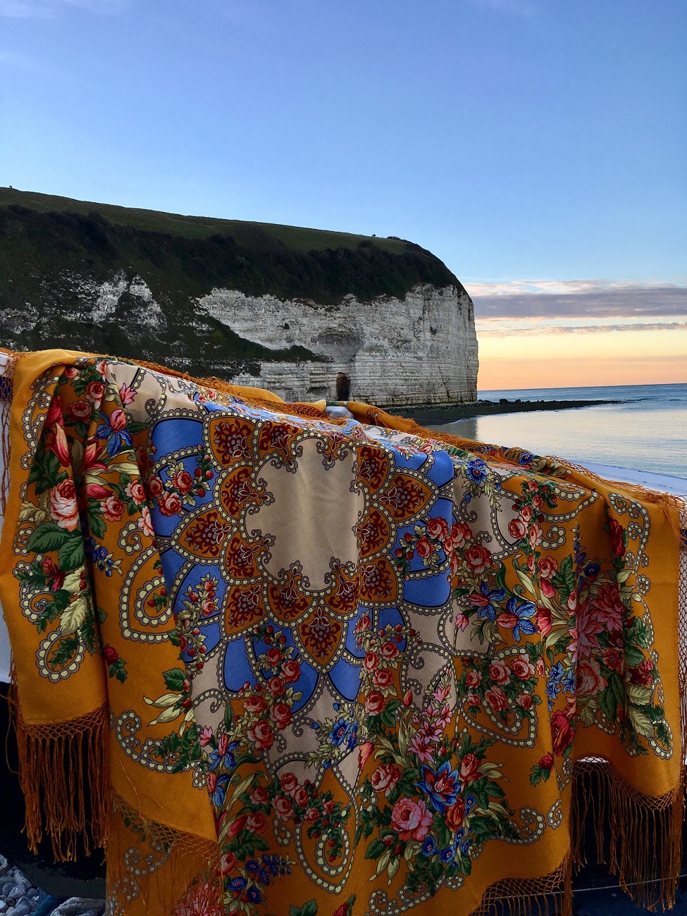 Прислали мне фотоотчет о поездке на выходные, наверное, чтоб убедилась, что подарок пришелся ко двору. Шаль носилась в хвост и в гриву – дочка надевала поверх шерстяной куртки в крупную клетку в цветах шали, с голубым джинсами и кирпичными ботинками, накрывала самого мелкого в коляске, привязывала его к себе, когда гуляли по обрывам.