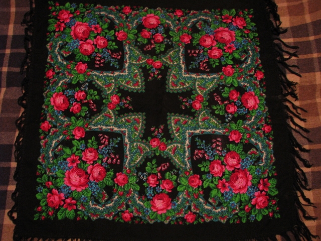 Удивительно. На авито появились 2 таких же платка, но с кистями. и почему-то с рисунком, являющимся точным зеркальным отображением моего (проверила в фотошопе):