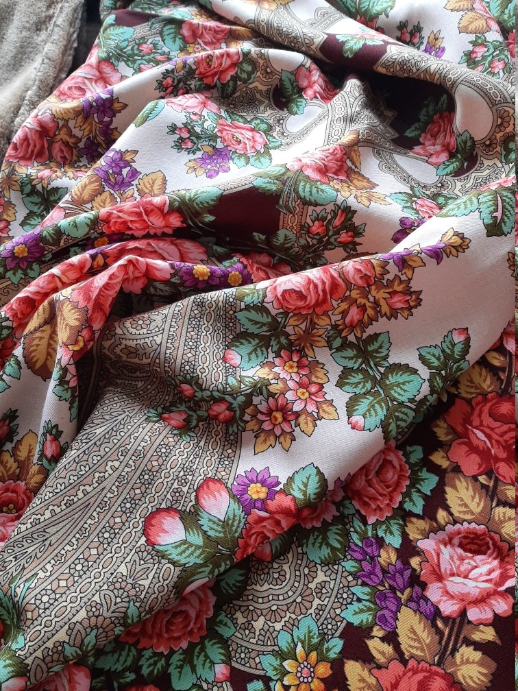 А я с 6-м "Чаиром". На нем бежевый с розовинкой, без желтизны. Пойдет многим. Очень нежная шаль, к ней, наверное, можно подобрать много цветочных духов, она живая. Очень ее украшают не только розы, но и мелкие цветочки, листочки, веточки.