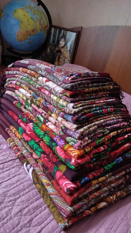 Шали висят на вешалках по одной штуке, слева направо по алфавиту от Б- Белые розы до Ц-Цыганка Аза, внутри одного названия по номерам колоритов. Все они на виду. С платками хуже, бардак у меня в платках