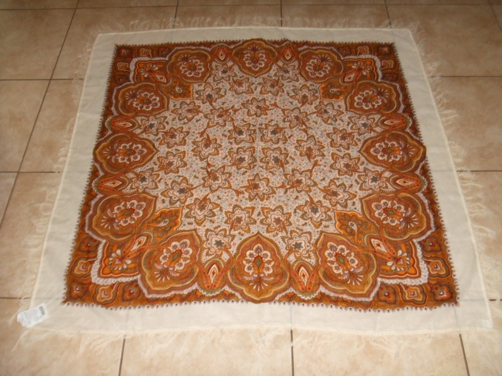 Дорогие форумчанки, есть вот такой платок 146х146 или даже 150х150, с шерстяной бахромой, клеймо мануфактуры, 1991 год. Фон более сливочный чем на фото. Как бы понять, что за платок. По розочкам на Ирину Дадонову похоже вроде бы.