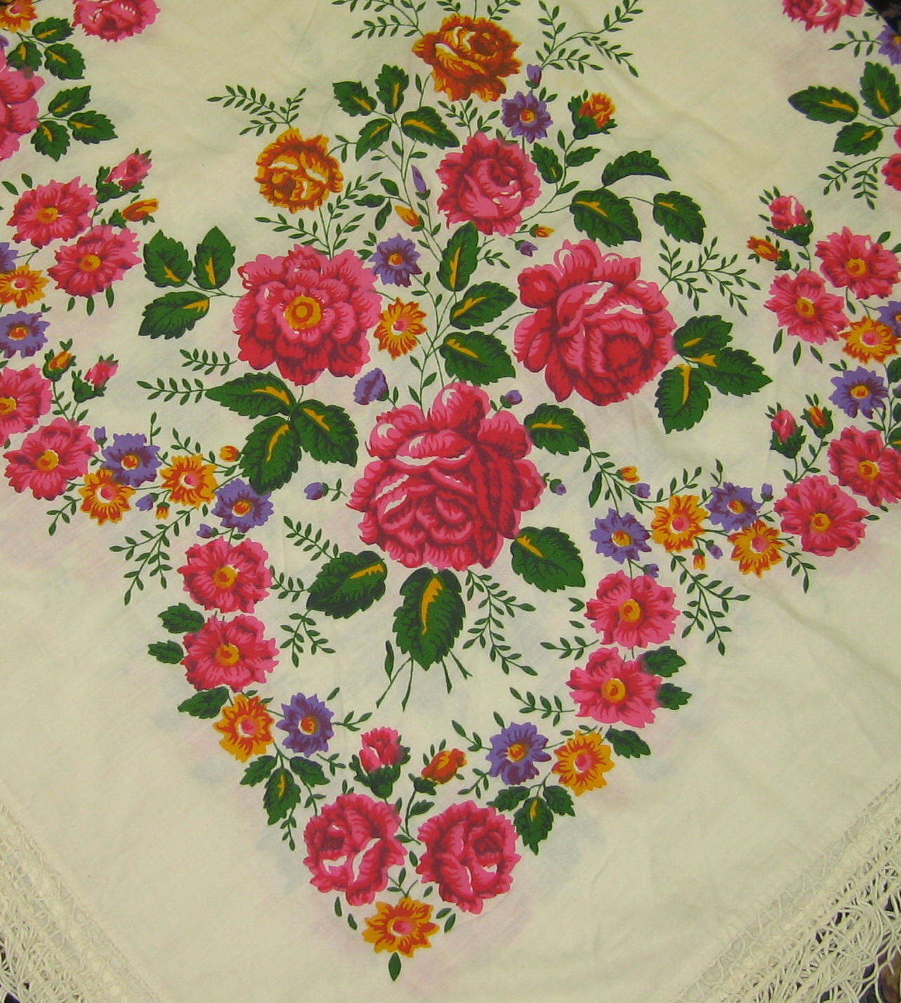 Этой осенью повела гулять своих борзых, захватила мусор (выбросить), подошла к помойке и вижу - лежит на боковинке платочек - мокрый (дождь был), грязный уже (серый такой).... в общем, я, покрутив глазами вокруг, цапнула этот платочек, дома сразу стирать, сушить, гладить... оказался нежнейшего бархатного хлопка очень приятного цвета такой вот платочек! Думается мне, что очень давно выпущенный, может, Павлово-Посадский Положила к своим, а перед этим - и на голову, и на плечи, и на шею - приятен на ощупь - слов не найти какой! И почему так редко выкидывают такое (хотя, лежал явно с надеждой, что кто-то возьмёт, вот я и взяла :" )