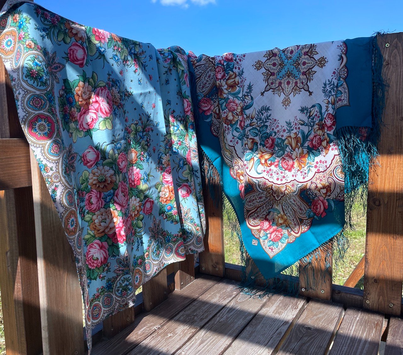 Будет позже сравнение всех трёх платков. А пока покажу РП на солнце, он удачно со мной выбрался на фазенду, где распускаются мои прекрасные розы.