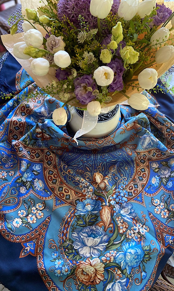 Собрала третий интересный мне колорит среди размера 89. Третий платок где цвет каймы не то морской волны (она всякая бывает), не то загадочной бирюзы горного озера. Первые два это Камаринская 12 и Воздушное настроение 12. Теперь к ним прибился Русский Перепляс 11.