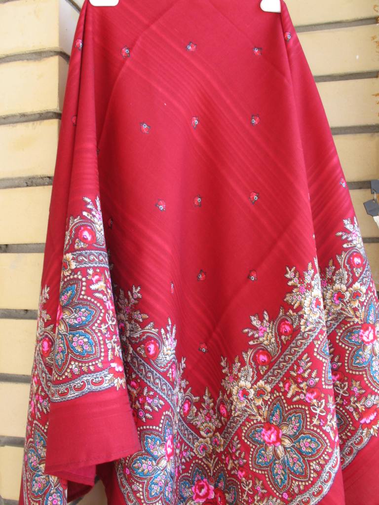 Они уже паковались, поэтому я мало что увидела. Ну, малиновая "Русь" с бахромой лежала. Какие-то платки с просновками без бахромы были, но я их не идентифицировала. Большие шали они уже попрятали.