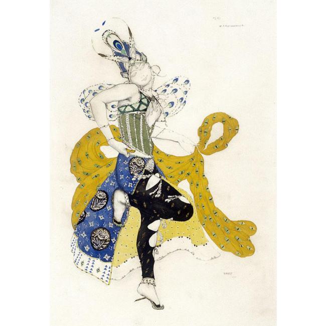 Платок Балаганчик своим узором давно и стойко ассоциируется у меня с эскизами балетных костюмов Льва Бакста. Какими-то такими: