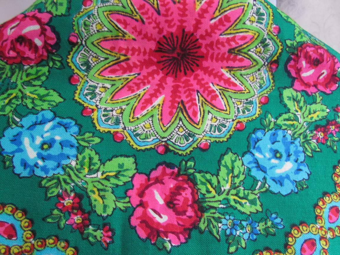 Здравствуйте, уважаемые Знатоки Шалей! Ко мне попал странный платок. Размер 150х150. Бахрома шерстяная, клетками. Печать нечеткая, как будто дорисована вручную, но рисунок очень интересный. Что это может быть такое?
