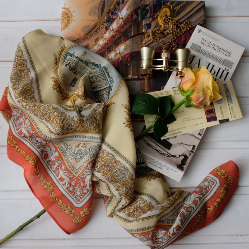 Тематический платок Малый театр. Крепдешин 89х89. Художник Татьяна Сухаревская.