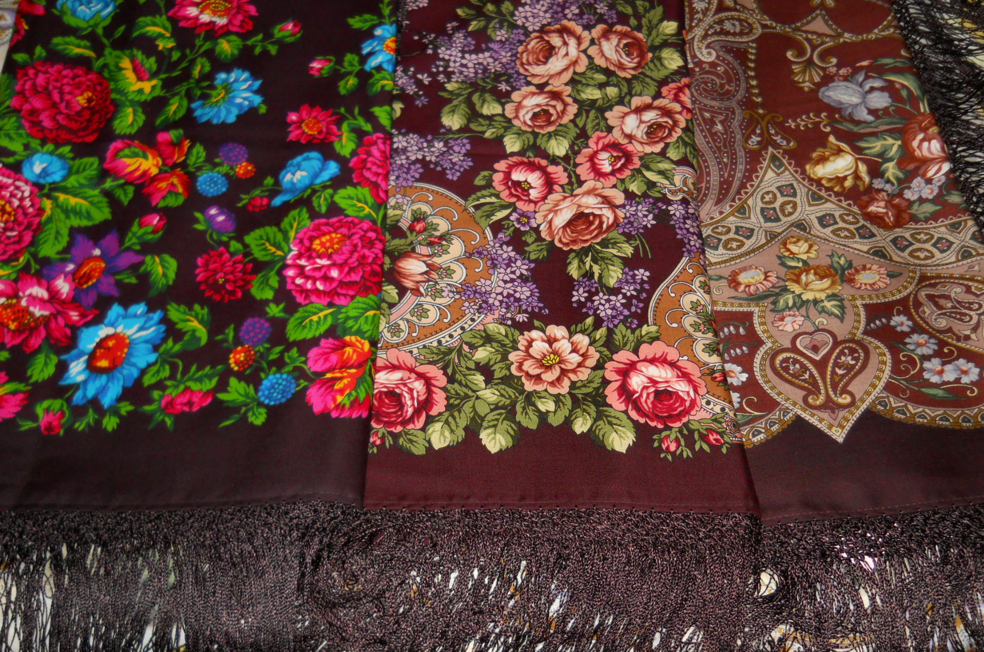 Eva, "там"- это передвижной ларек на ярмарке выходного дня, которых много по Москве, просто раньше никогда платков посадских не привозили. Сиреневого тумана было 2 шт., оба куплены