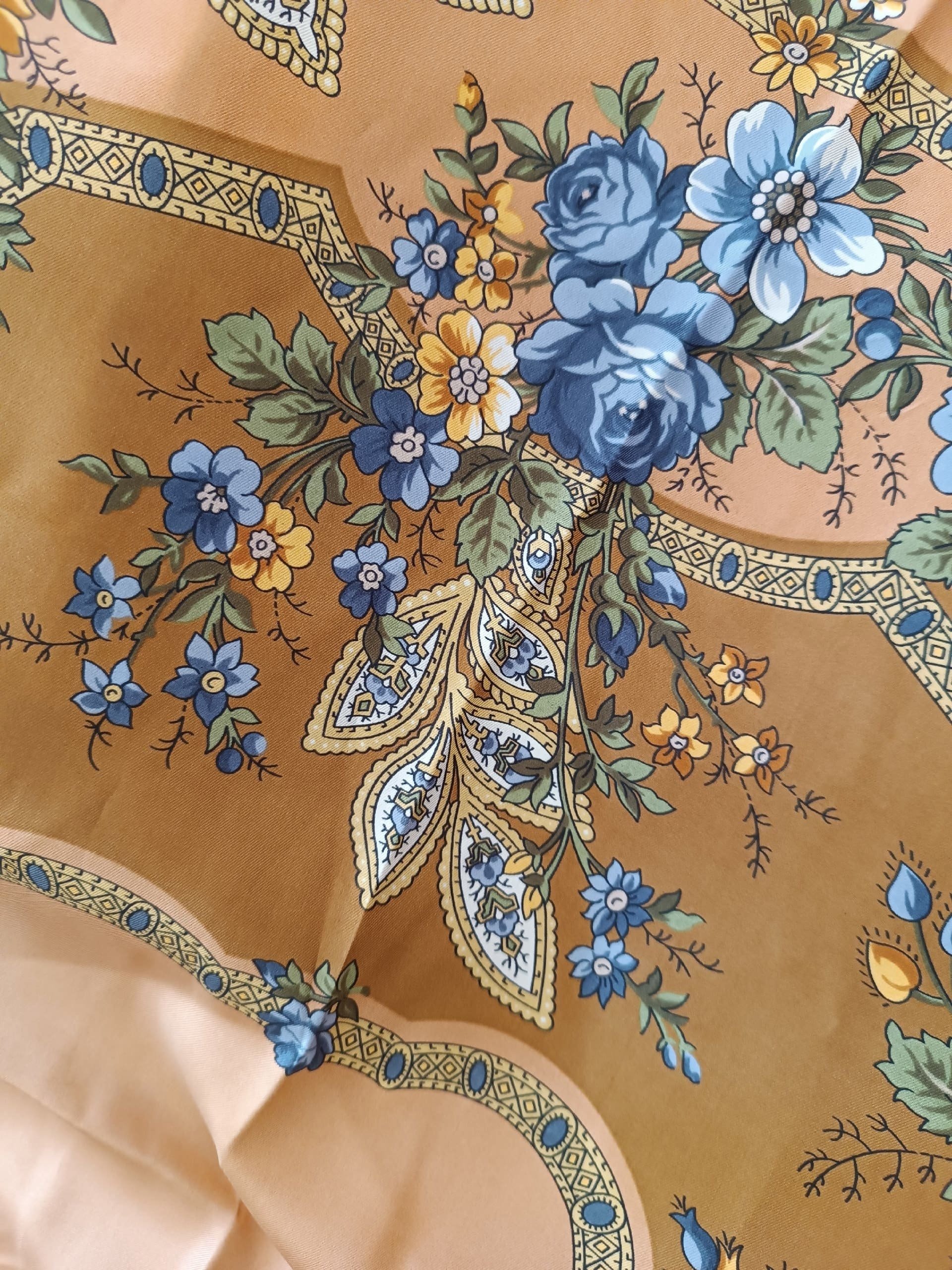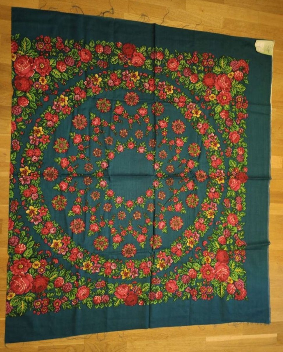 Удача мне улыбнулась и Пробуждение в неведомом 1 колорите теперь у меня в коллекции. Ткань прежняя, скорее всего саржа, поже сравню со стареньким Санкт-Петербургом Сухаревской. Цвет разительно отличается от картинки в галерее, намного ярче и кайма стального оттенка. Извиняюсь за помятость, только что с почты. Целиком позже сделаю фото для архива, пока фрагменты.