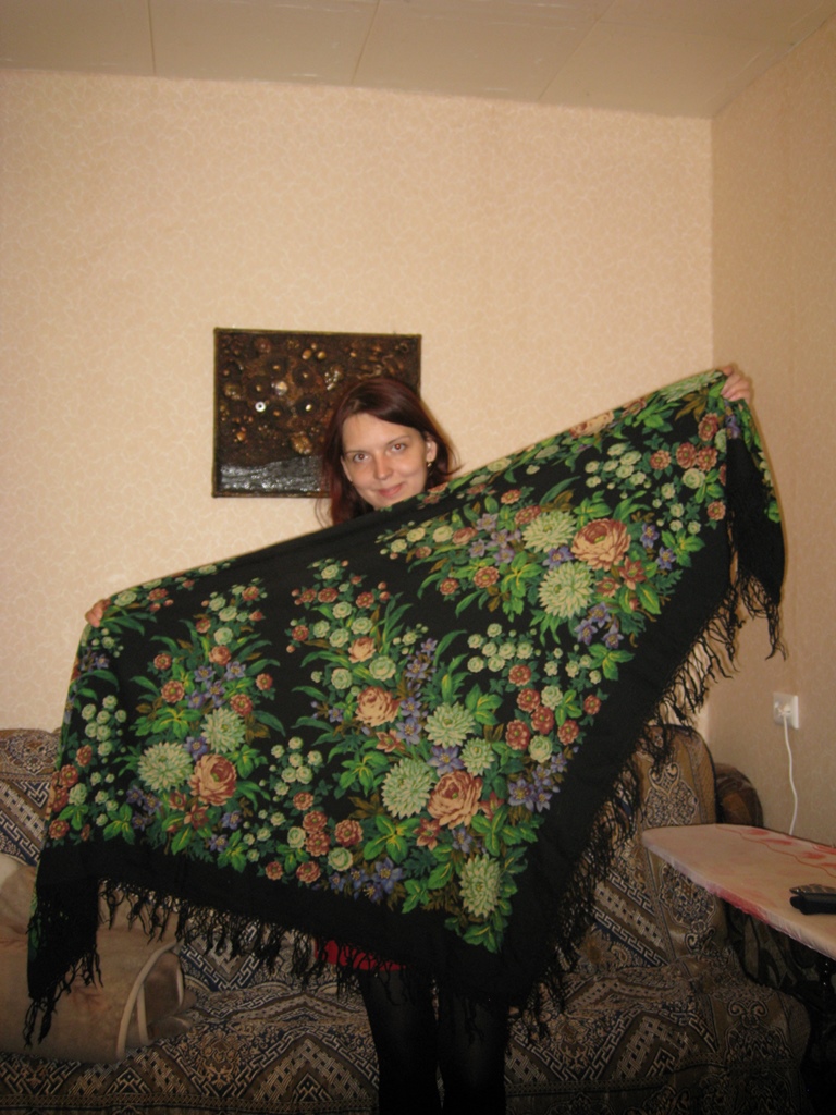 Здравствуйте! Есть у меня шаль, еще мама в молодости носила. Не из павловопосадских ли она? Ткань довольно плотная, шерсть, размер полотна примерно 145х145, по низу украшена шерстяной бахромой с плетением. Платочек старенький, пережил не одну стирку, и почему-то мне кажется , что розы изначально были ярче, зелень сочная, но точно не знаю, не видела каким он был "до". На фото розы кажутся красноватыми, на самом деле они бордово-коричневые и лепестки георгин в серединке слегка розовые и это мне кажется старит платочек. Хотя сам узор очень мне нравится ! Пока не решилась выйти в нем в люди, хотя примеряла :Q