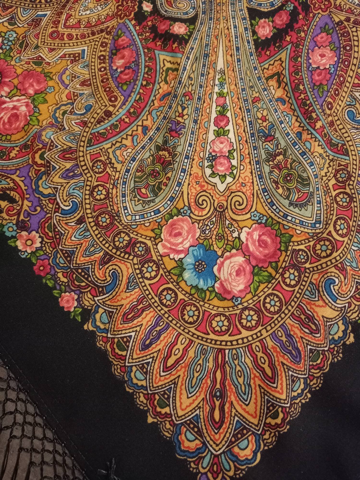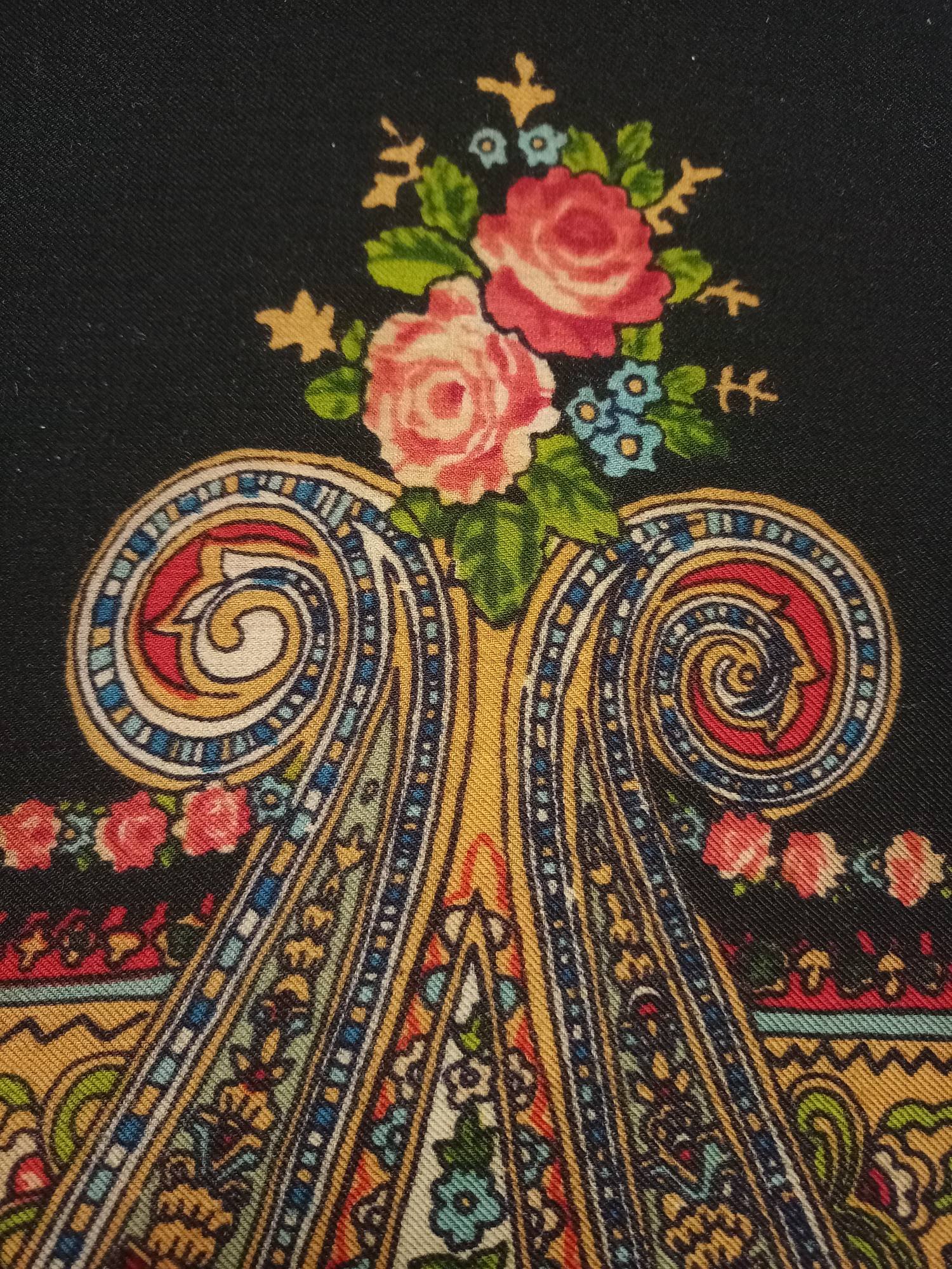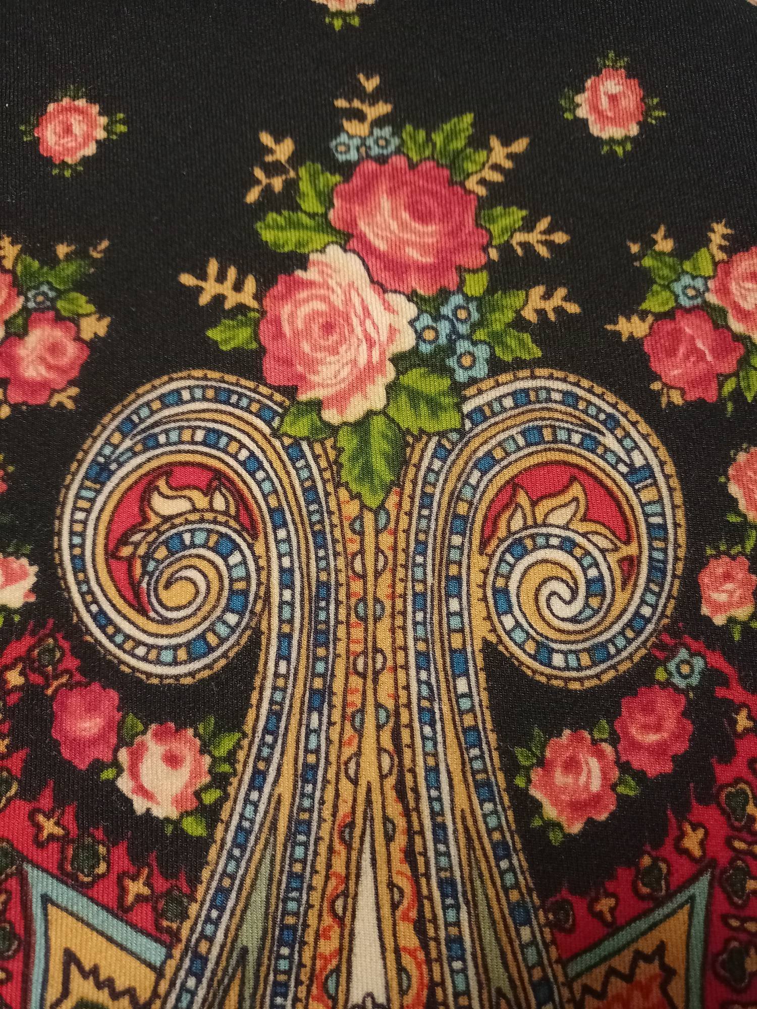 Тончайшая прорисовка, что, впрочем, свойственно павловопосадскоми шёлку. Усилены чёрные контуры, в чём я вижу отсылку к старинным рисункам. (Тот же приём вспоминается на платке Испанский Зубрицкого.)