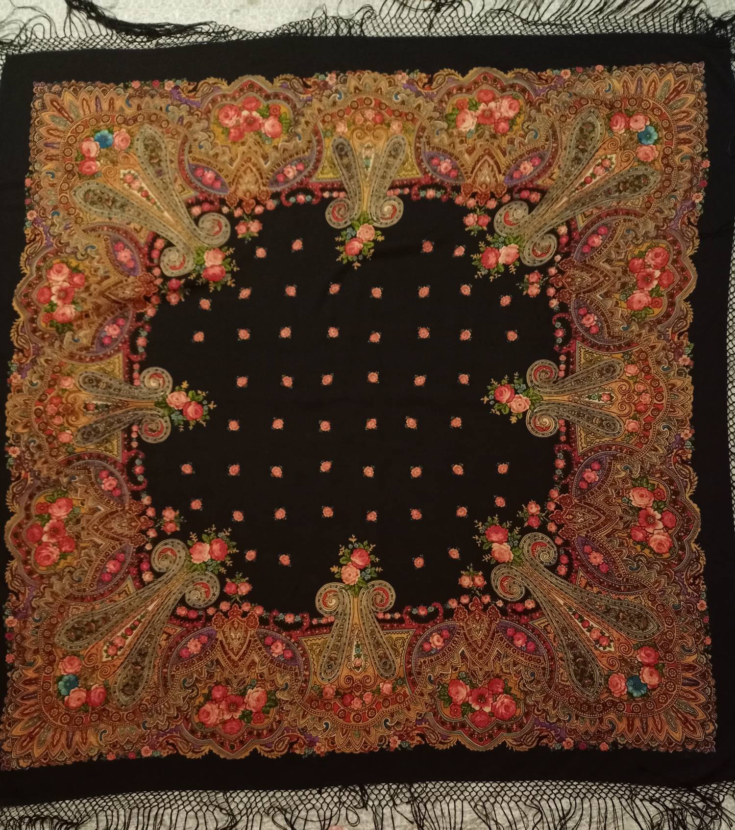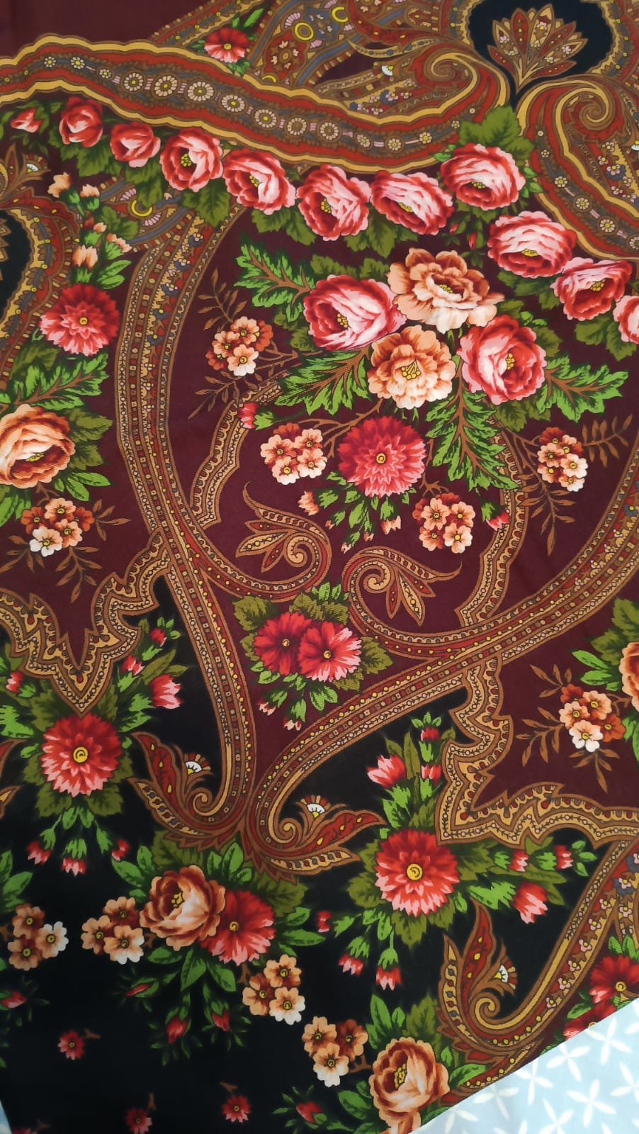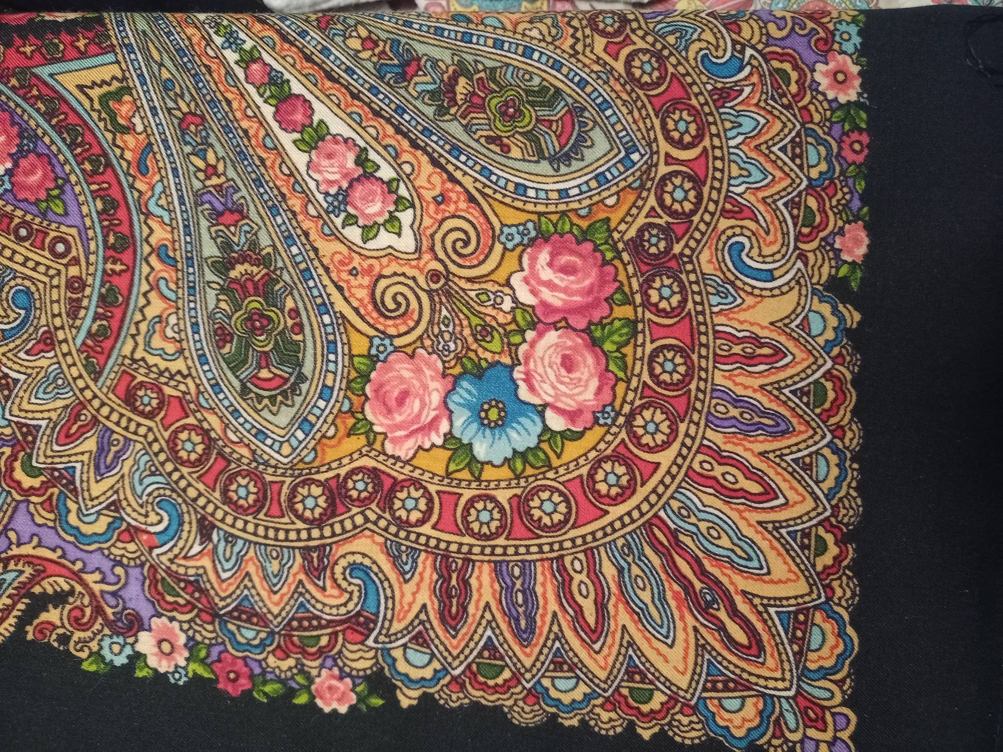 Тончайшая прорисовка, что, впрочем, свойственно павловопосадскоми шёлку. Усилены чёрные контуры, в чём я вижу отсылку к старинным рисункам. (Тот же приём вспоминается на платке Испанский Зубрицкого.)