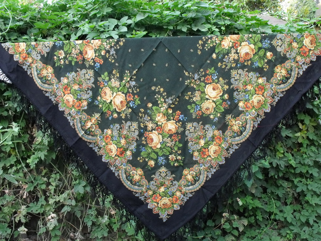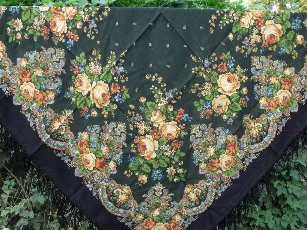 Наконец могу выставить фото платка из действующего каталога,но ещё не представленного на форуме. Кайма чёрная,середина- тёмно-зелёная.Ткань тонкая,светится рисунок нижнего слоя.