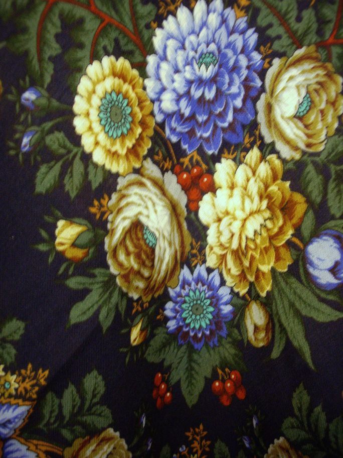 Платочек мне лично понравился. Кайма черная, фон темно-темно синий, почти черный, но без фиолетового. Зелень не оливковая, а скорее темно-зеленая, и яркие капельки ягод.