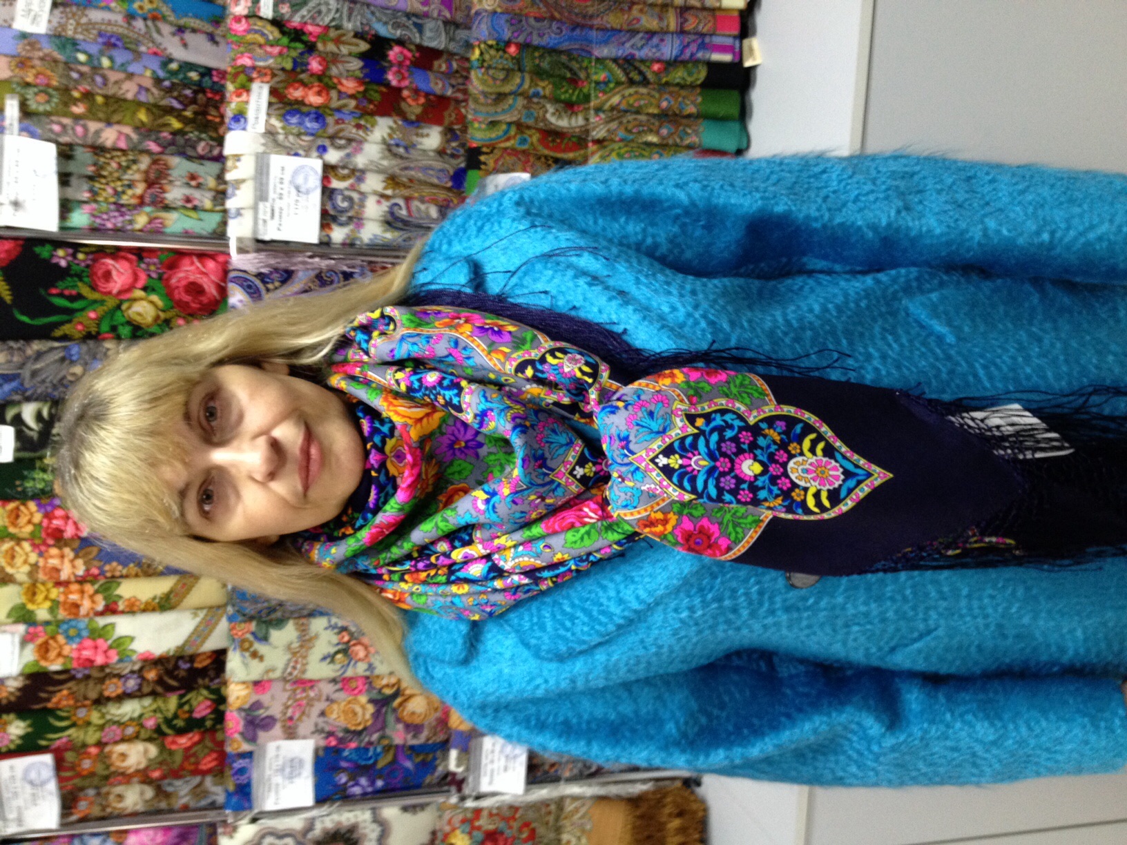 Вот уже неоднократно для себя подмечала (даже можно взять за правило), что выбирай в шали/платке любой цвет из орнамента, не доминирующий, из деталей, и клади шаль на такой же фон! А поскольку шали многоцветные, то вариантов огромное множество, и каждый раз шаль звучит по-новому! Показы наших дам ещё одно тому подтверждение.![]()