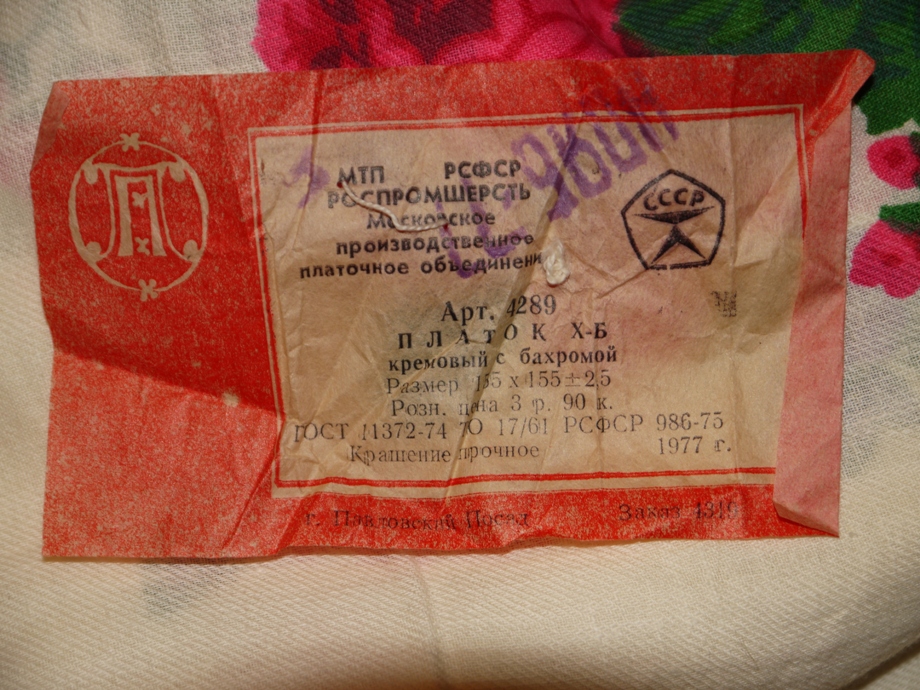 Сегодня нашла этикетку хлопкового платка. 1977 год. Теперь можно сравнить две этикетки - смесового и хлопкового. Разница в цене оказывается в три раза ( не в пользу хлопкового)