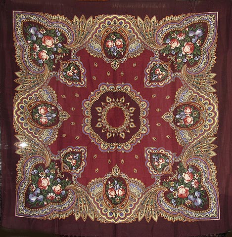 Ехала я вчера в трамвае и всю дорогу на женщине платок рассматривала. Так увлеклась узором что чуть не проехала остановку. И сегодня узнала что рисунок этот называется "Восточные напевы", автор Клара Зиновьева. Может знаком кому-нибуть, подскажите артикул? Кайма чёрная.