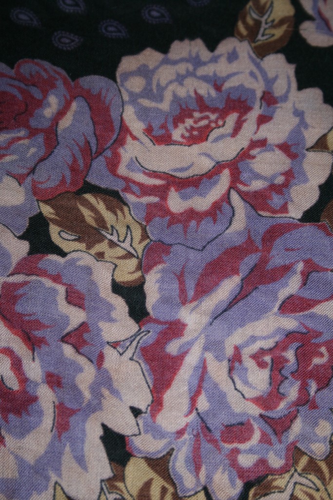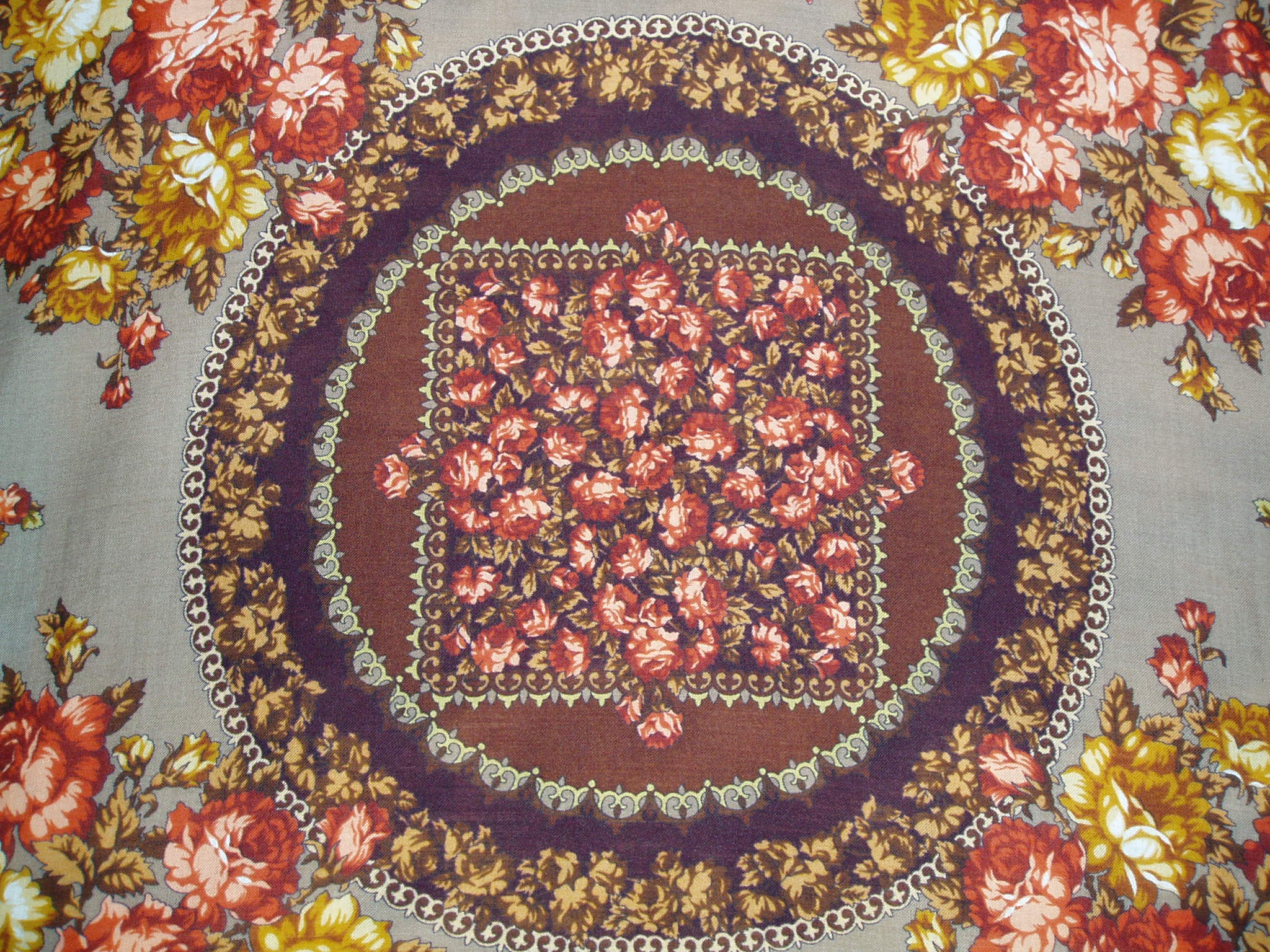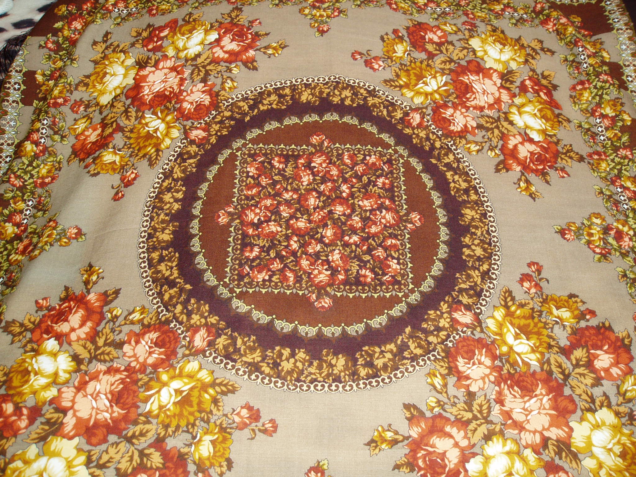 Я тоже платочек покажу :) Вынула его из шкафа и увидела совсем по-другому, чем сразу после покупки. Красавец же просто! Покупала летом, и от такого жаркого колорита даже дурно делалось, а теперь любуюсь - не налюбуюсь. И огонь в камине, и осень красно-золотая, и кисти рябины (хоть там её и нет:)).