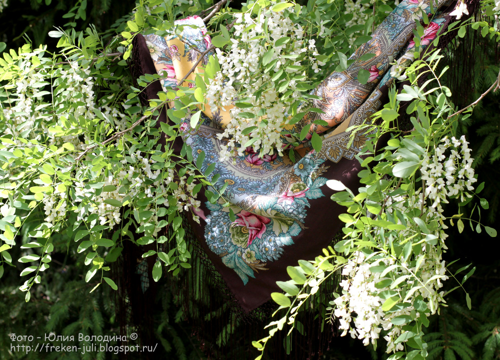 Я решила в своей фотозарисовке соединить эту шаль с благоухающей пеной белой акации.