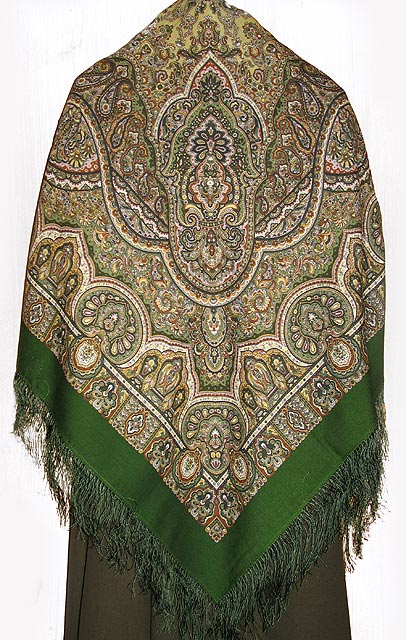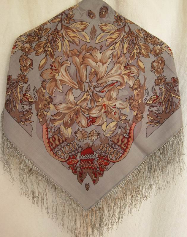 Этот платок "Сады Шираза" (855-7 размер 89х89 шелковая бахрома) еще есть на сайте, в печатном каталоге его нет. У него очень мелкий сложный рисунок, который трудно разглядеть на сайте, а жаль!
