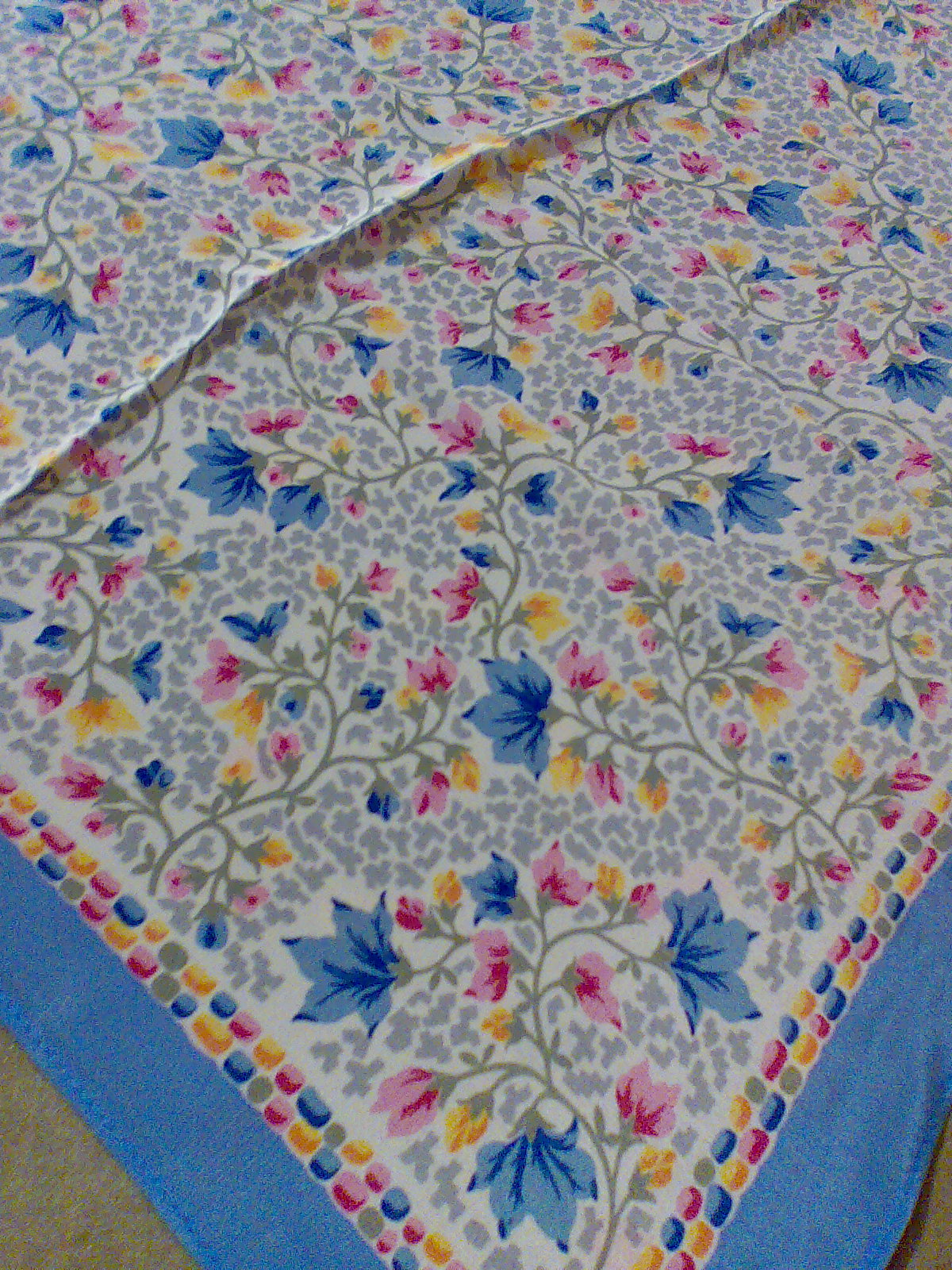 У меня он совпадает с изображением на сайте: фон медальонов - сиреневый и розовато-бежевый, цветы - коралловые, орнамент - бежевато-песочный, а вот голубого цвета не наблюдается.