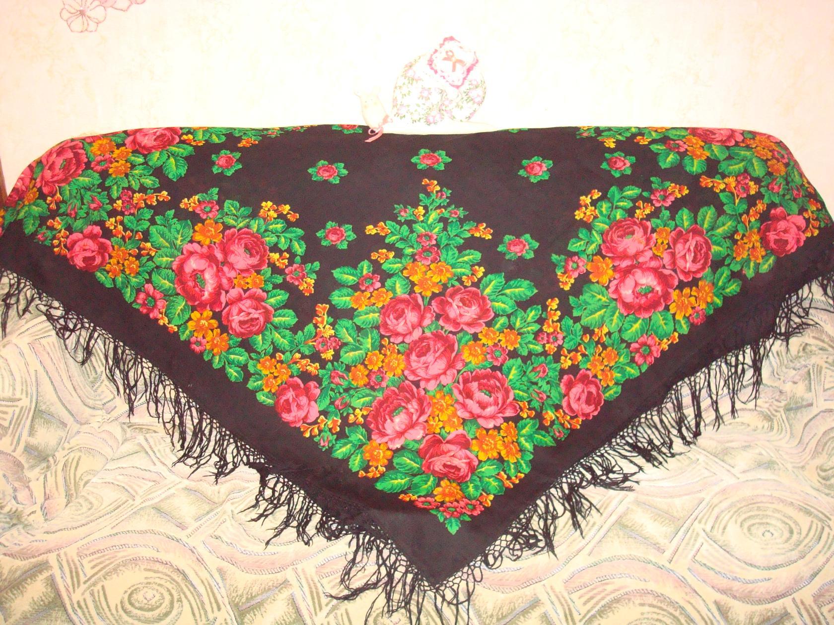 Здравствуйте! Прошу о помощи! Попал мне в руки платочек, нашла я его, путешествуя, на стене деревенского Дома Культуры(было украшено к празднику). Выпросила-вымолила, отдали его мне. Он 146х146 см., примерно конца 80-х, начала 90-х годов,ткань очень тонкая.И этикетки, конечно , не сохранилось. Бахрома похожа на х/б. Помогите опознать! Очень хочется узнать, кто автор этой красоты. Видела на форуме фото такого платочка, тоже владелица пыталась опознать, у нее ,вместо золотистых, мелкие цветочки были синие. Помогите!