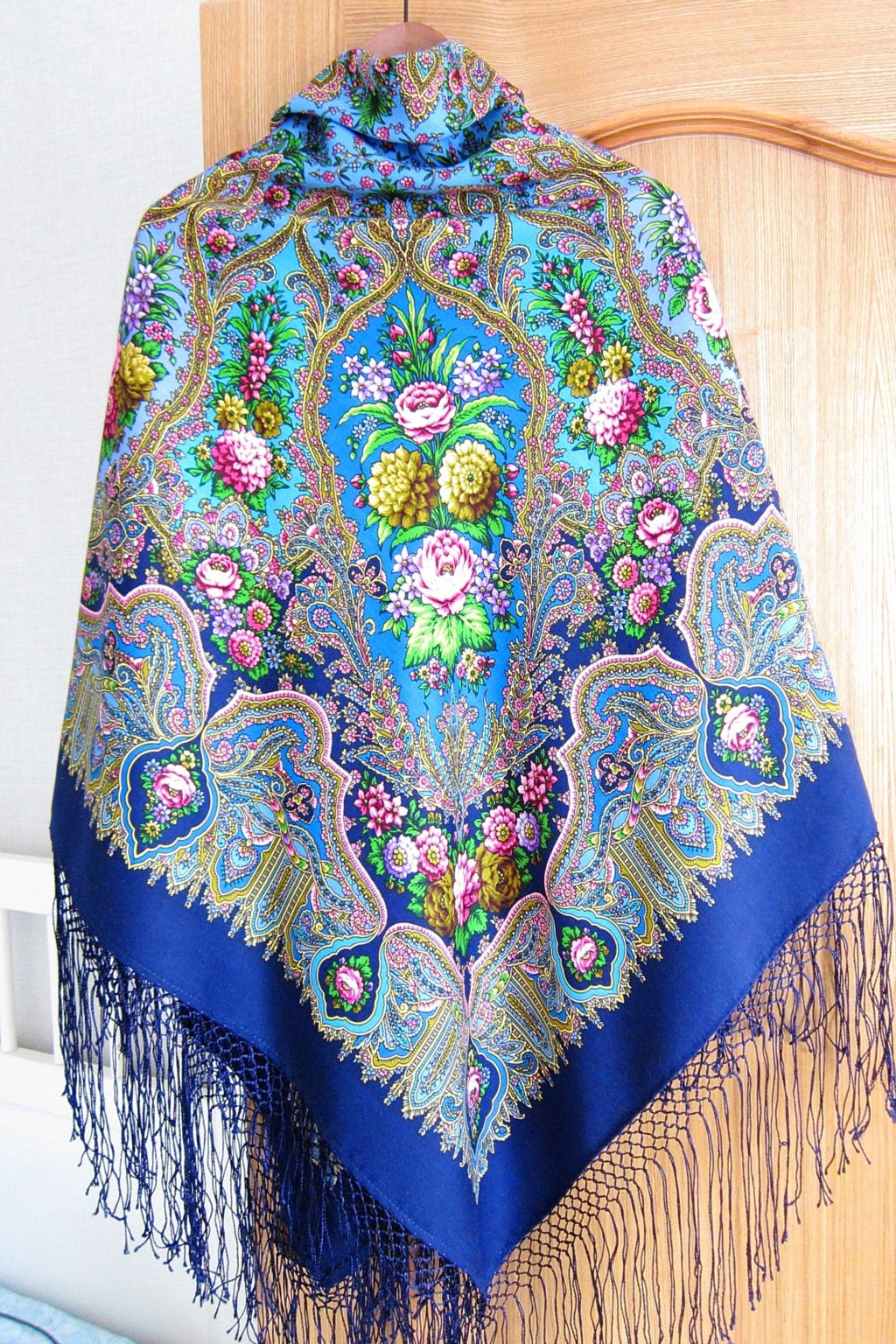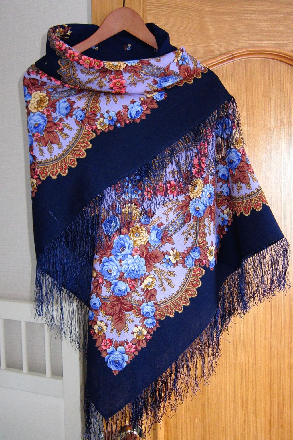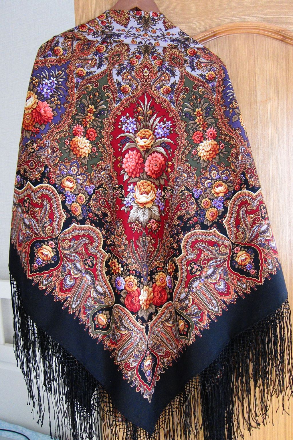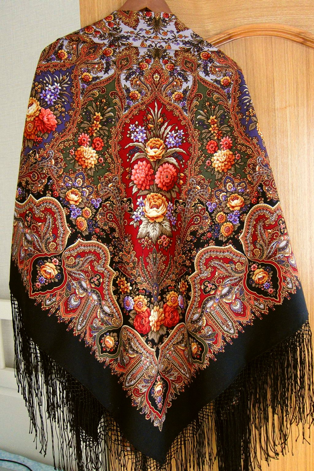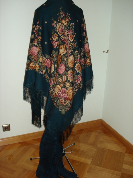 Мне кажется, она ждет-не-дождется этого момента! Шаль прекрасная, золота на ней столько, что черный фон отступает, и Вам будет хорошо в ней.