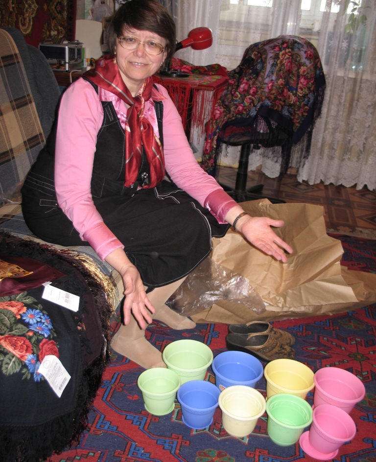 На полу всё это время валялись упаковки от посылок. Резко не хватало котов. Они ведь обожают прятаться под такими шуршащими бумажками. Зато пришла дочка, принесла горшочки для цветов. так вдруг соединились платочки и будущие цветочки. А пока я пошла на компьютер поглядеть, что же муж наснимал, он другим фотоаппаратом ещё пощёлкал платочки, мне очень понравилось, что получилось, вот такой заключительный аккорд.