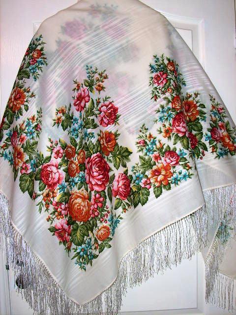 "Розы на снегу", "Отрада" с бурыми фестонами, а также поплиновая шаль 70-х гг. прошлого века (т.н. павловопосадский хлопок).