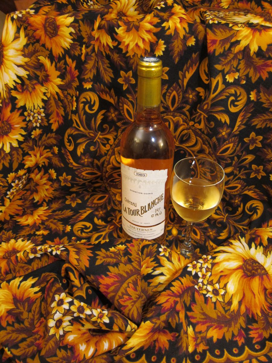 Платок Подсолнухи и сотерн Chateau La Tour Blanche 1er cru, 1989 год (Бордо, Graves, Sauternes). Copта винограда - Семийон, белый Совиньон и Мюскадель. Это сладкое вино делается из винограда, пораженного благородной плесенью (pourriture noble), что придает ему характерную горчинку. Для француза на Рождество сотерн и фуа-гра - непременный атрибут праздничного стола. Хотя для меня гораздо интереснее сочетание сотерн-рокфор или сотерн-устрицы (сладкое-соленое). А теперь вижу, что сотерн -"Подсолнухи" - тоже очень неплохо ))))
