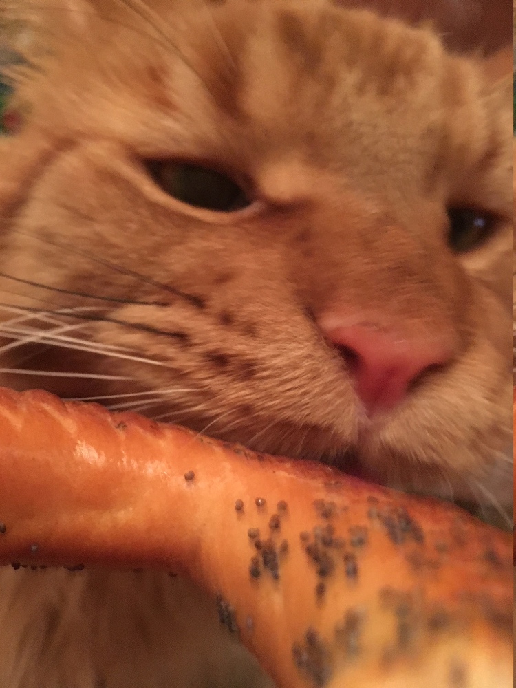 И никак я не ожидала, что эта рыжая морда поведет себя невоспитанно, ну, ладно еще попрошайничать, но чтобы в мой бублик вцепиться зубами и тащить его на себя, пытаясь откусить побольше, это уже верх наглости. Гонорар за съемку требовал.