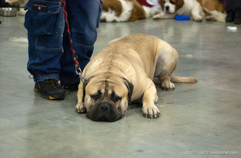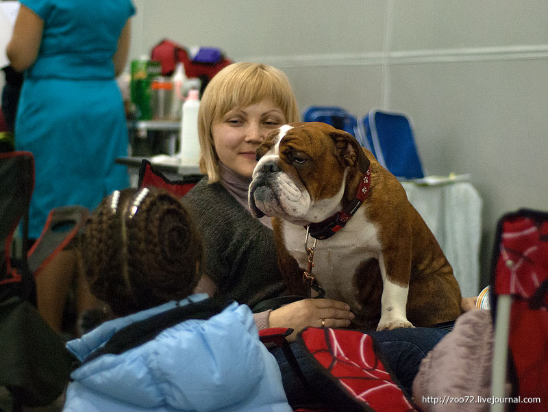 Второй день выставки был не столь удачен. Эксперт написал нам в описании собаки, кроме всяческих exelent-ов, что собака несколько толстовата в пояснице, что портит её общий вид и мы были в пролёте. Он был совершенно прав, так как домашняя дразнилка Баси - пельмешка. До выставки, в Питере, мы ходили с ней заниматься на беговой дорожке-тренажёре. Думала, что немного сбросит. Но, к сожалению, жир частично перешёл в мышцы, а ширина не убавилась, только уплотнилась. Так как диета для Баси не писана, она всё равно свой недоед где-нибудь, да наберёт. Охотница, растудыть...