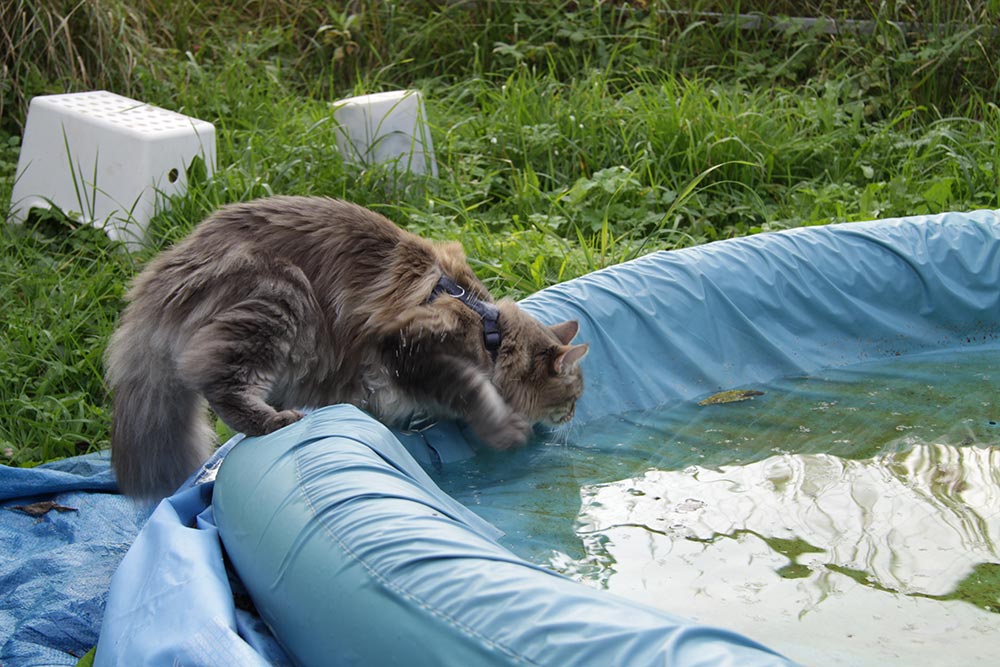 Кот дело заразительное, покажу и я своего. Спускали бассейн, без кота конечно никак, полез проверять ну и водички похлебать.
