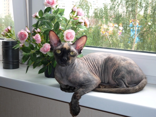 Мышонок(Мышка), первая наша киса, появилась у нас случайно, позвонила тётя моя(она ветеринар), и говорит: "Принесли котёнка-сфинкса усыплять, ей месяц, болеет, скорее всего ринотрахеит, очень истощена, но поднять на лапы можно, возьмешься? Т.к. хозяйка категорично настроена, сказала - не усыпите-выкину её!", ну я конечно согласилась, мне ее привезли, ой страшно было это "несчастье" брать в руки, на ладошке помещалась, одни косточки, и глаза с носом такие больные-больные. Ладно, выходили, красотка стервозная выросла :D