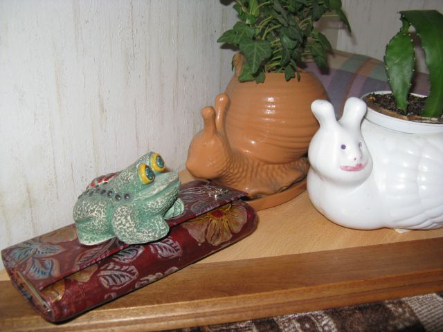 Милые Дамы! вот он ,мой Жабенок, агитирует улиток за бережливость. И хомяк, грустный такой, ведь не все скопил...( в роли жабенка - сувенир, в роли хомяка - пекинес Ю Сань).