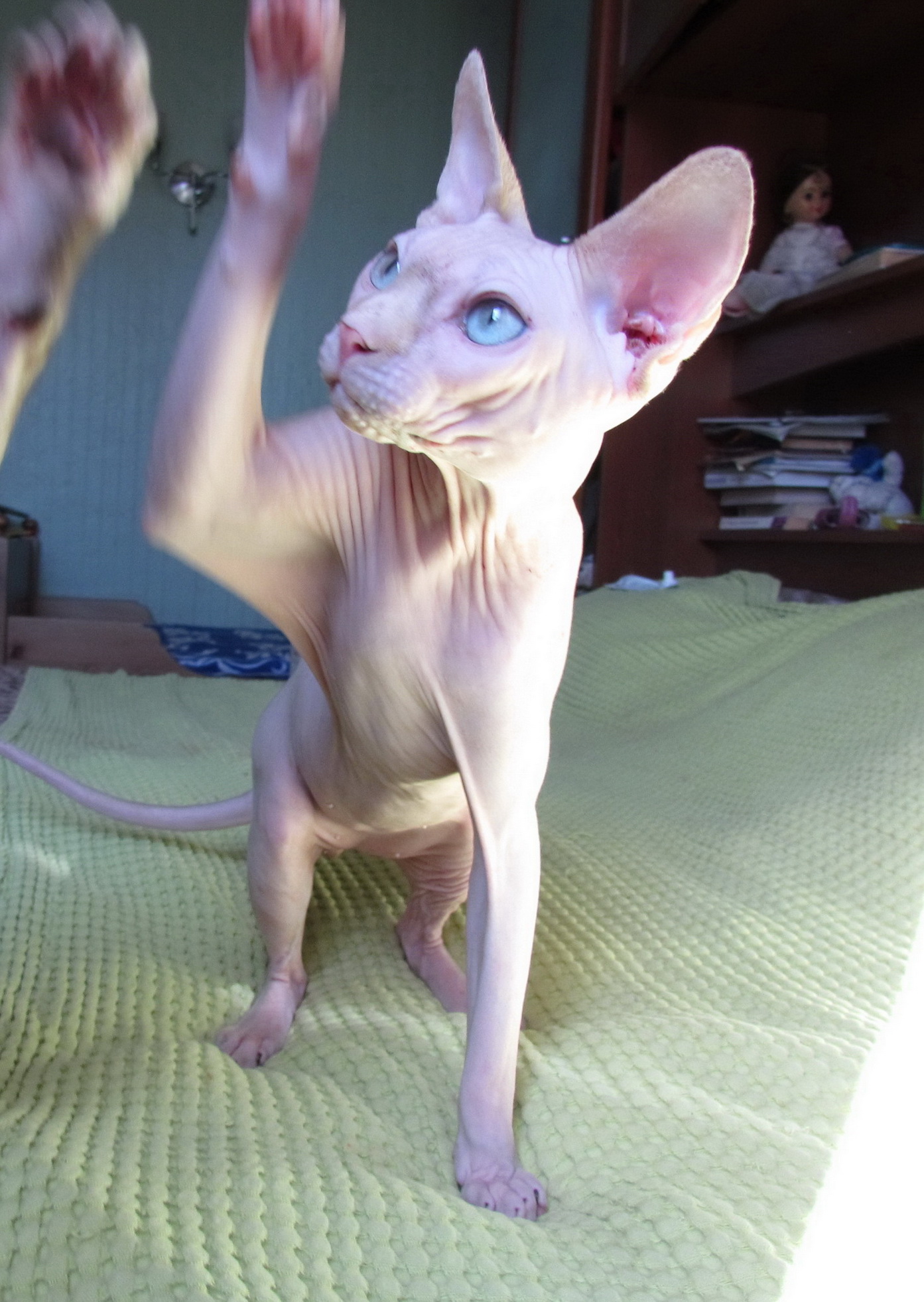 Все еще ищет нового любящего хозяина молодой кот сфинкса, голубоглазый красавец титулованный грандчемпион - Моцарт, домашняя кличка - Царь (вот так скромно - знакомимся - просто Царь). Нежный романтик и преданный кот. Ночью тихо спит в ногах на кровати. Любит дышать в ухо. Трется щекой по носу.