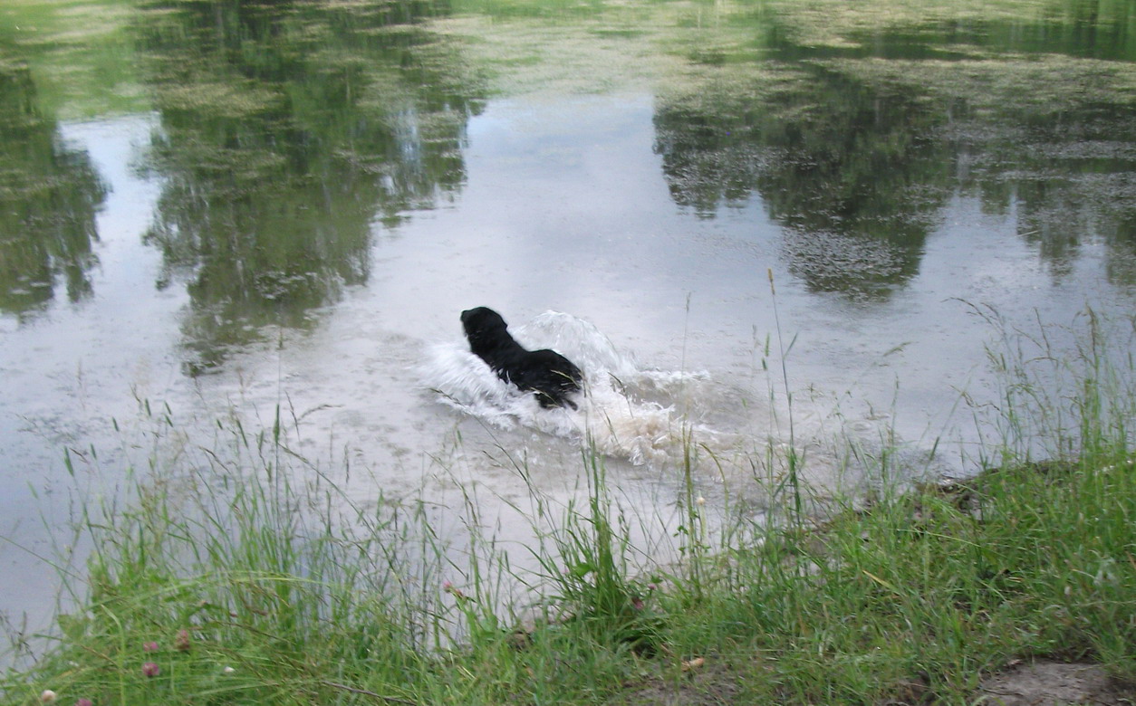 Это завораживающее и умиляющее зрелище- плывущий пес. Мы на даче специально возим Рича на лесное озеро - отвести водоплавающую собачью душу. Пока мы на берегу откармливаем комаров, наш собакин плавает, ныряет и пытается ловить на плаву водомерок.