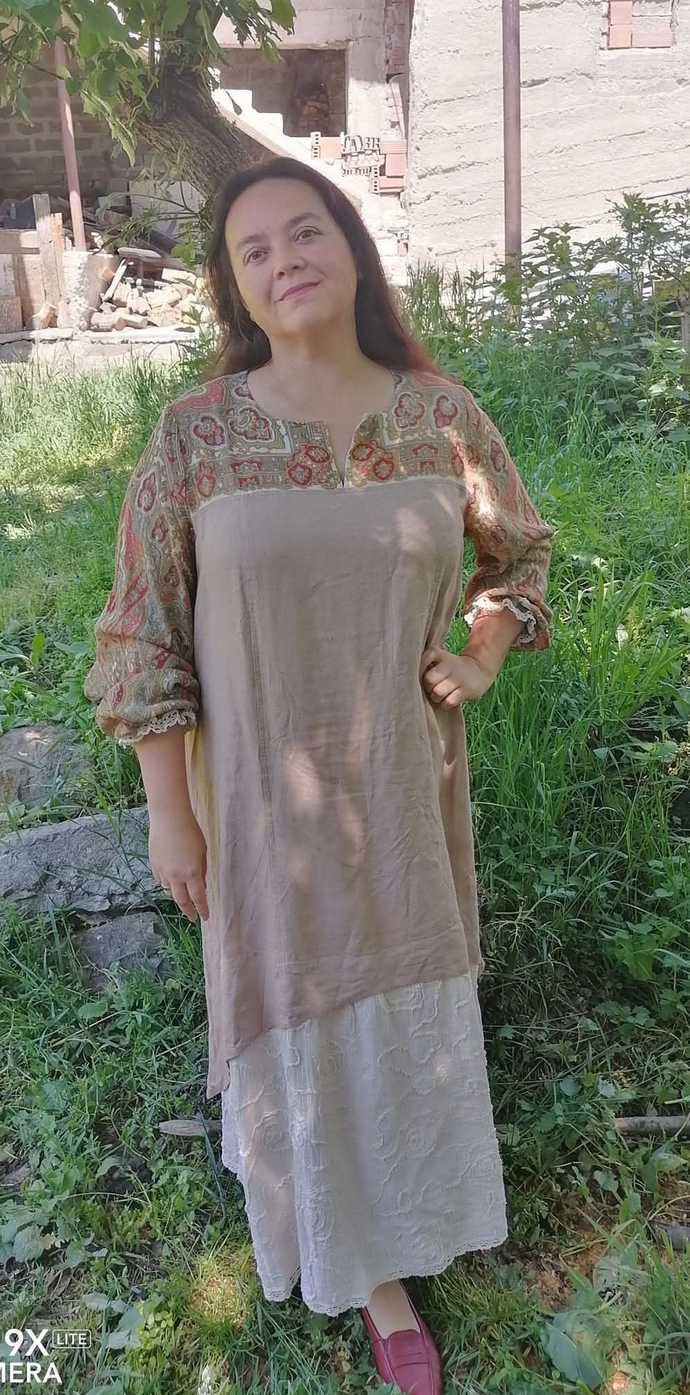 Тема использования мотивов национального костюма в современном гардеробе мне очень близка. Вот эти два льняных платья-бохо я сшила на заказ. Рукава и кокетка бежевого - платок Ольга Лабзина 3