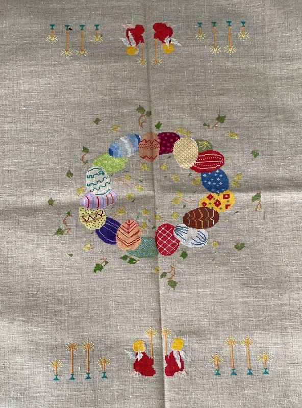 Я заканчиваю "Вечноцветущий сад". Нашелся мой забытый раритет--пасхальная скатерть 1994 года. За основу брала обычную льняную скатерть ( не равномерная канва). Сохранилась в отличном состоянии , будто вчера закончила.