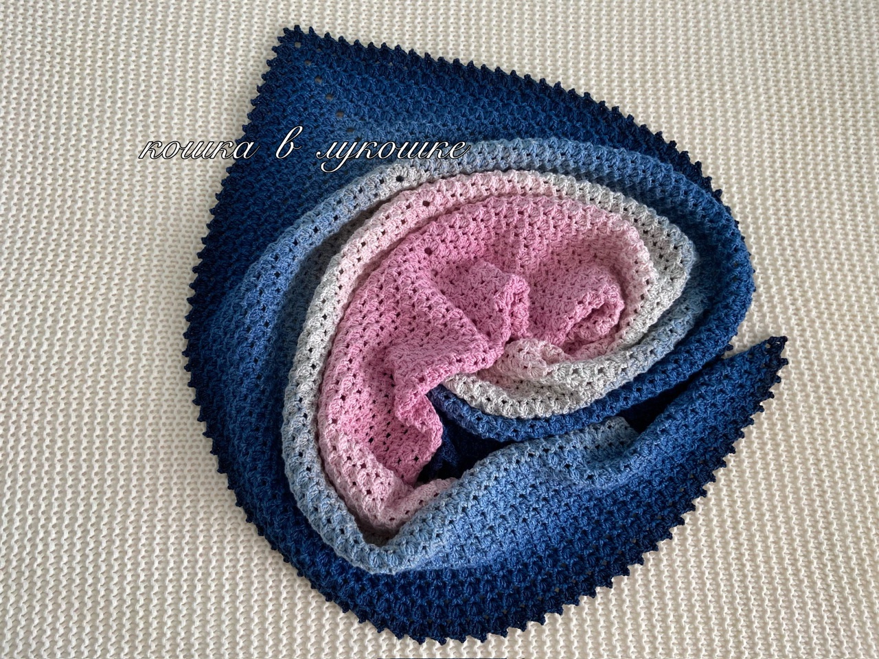 … в тему «об утилизации» комочков пряжи от разных изделий. Простяцкий узор, легко вязать. А в итоге получился вот такой большой и роскошный хлопковый рельефный бактус (почти шаль) из 2 разных мотков пряжи. Даже градиент красиво подружился совершенно случайно (от розового кварца к насыщенному сапфиру)