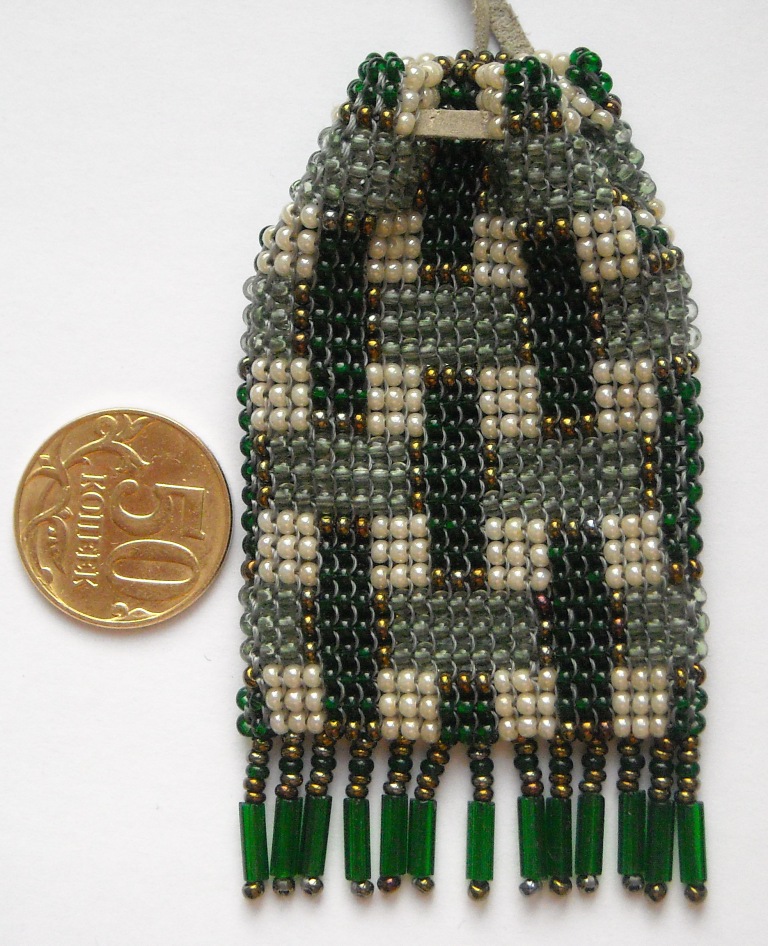 Раз уж зашел разговор о бисере, посмотрите какой маленький кисет мне сплела наша учительница английского языка к литературному празднику Р.Бёрнса. Как будто из тартана. Его можно носить, как кулон. Его размер 3,5х5,5 см.