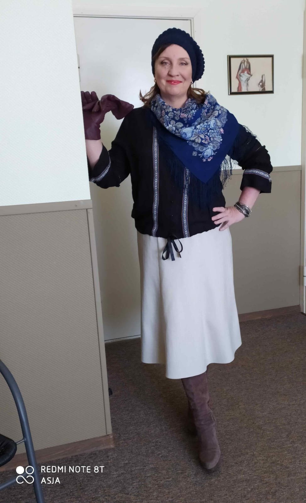 Дорогие дамы,специально для вас надела сегодня такой очень мягкий,намеком ,этно-вариант для тех,кто только вводит потихоньку нечто национальное в костюм. Блуза с тесьмой и бахромой ,платок и то ли шапка,то ли берет,с попыткой отсылки к мягким повойникам)