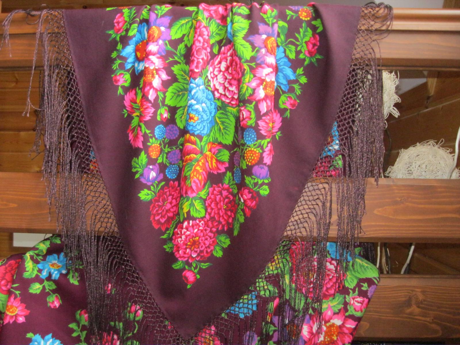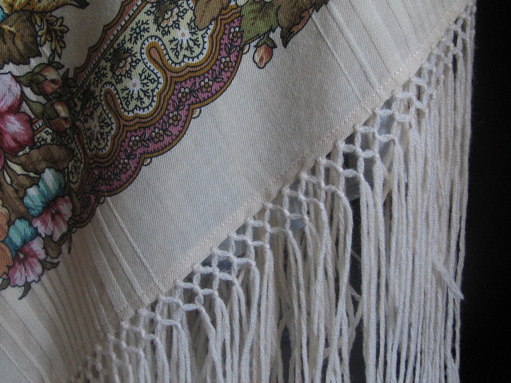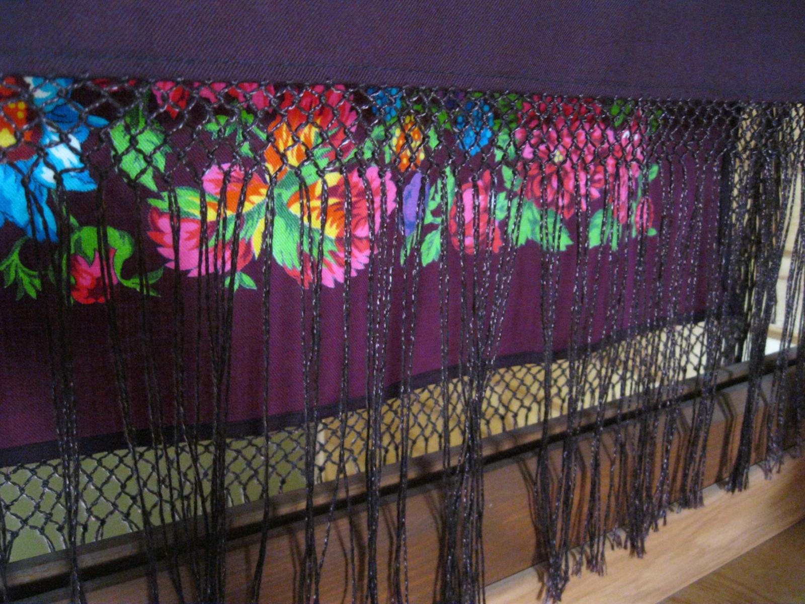 Выкладываю обахрамленную Именинницу 1446-1. Нитки подобрались идеально в тон . Много клеточек решила не вязать.( для пробы - как будет носиться ).Но на мой взгляд такая бахрома упростила богатый колорит платка. Шаль стала какой-то домашней. А с вискозной бахромой выглядела поблагороднее. Но переделывать не стану, пусть будет как есть.